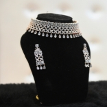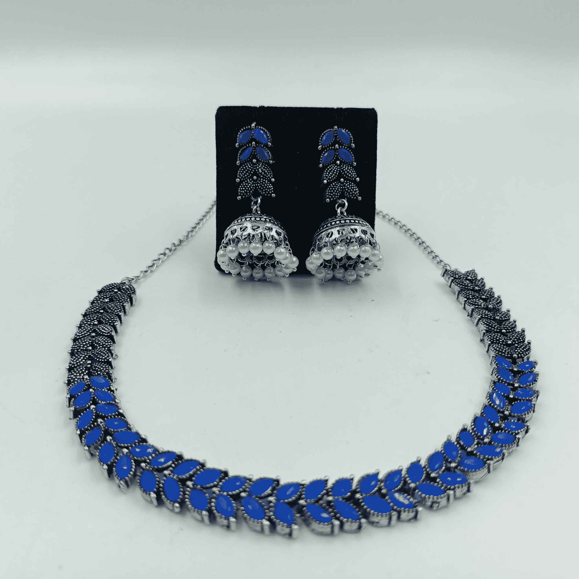 Timeless Elegance Silver Oxidized Blue Color Chokar Necklace Set with Zhumki