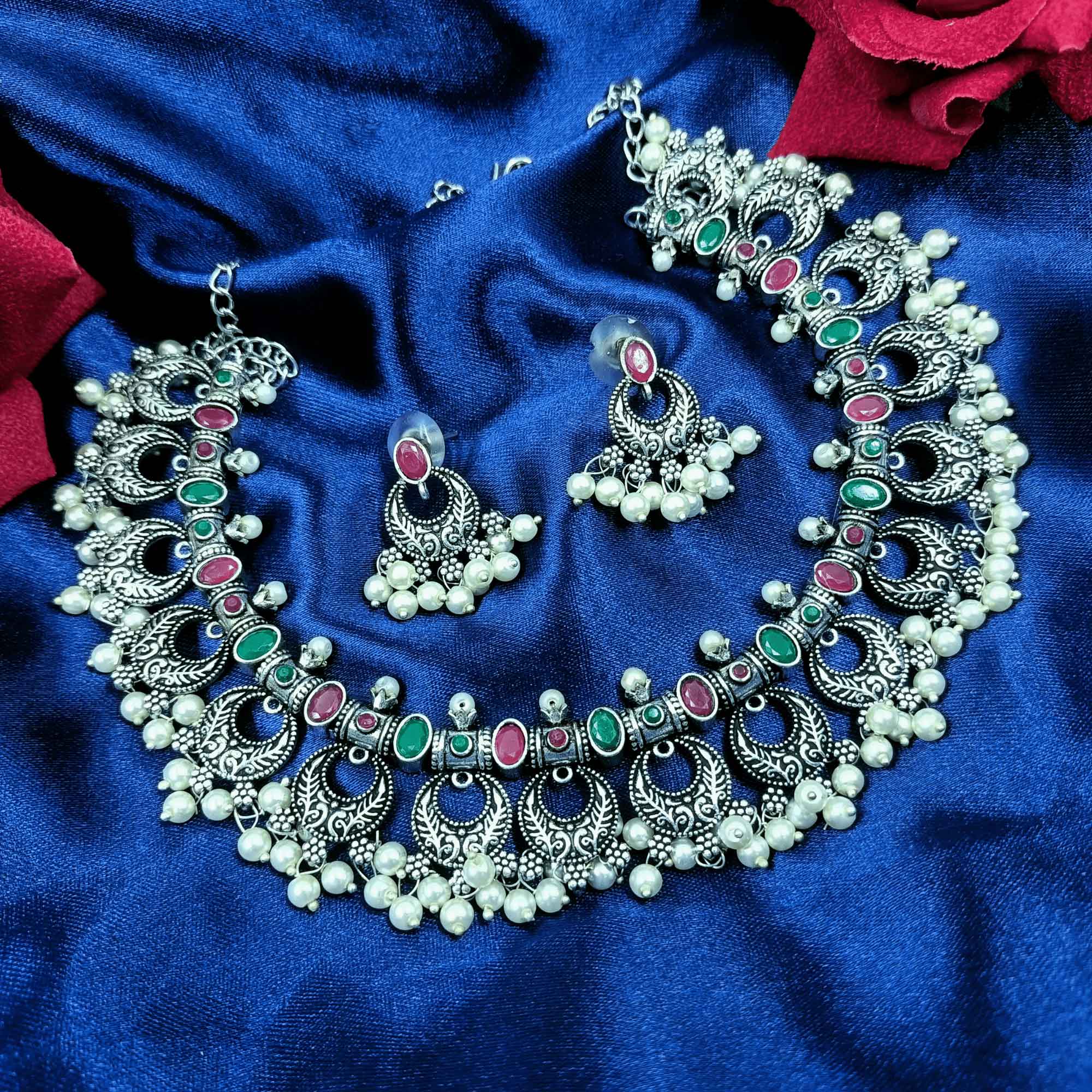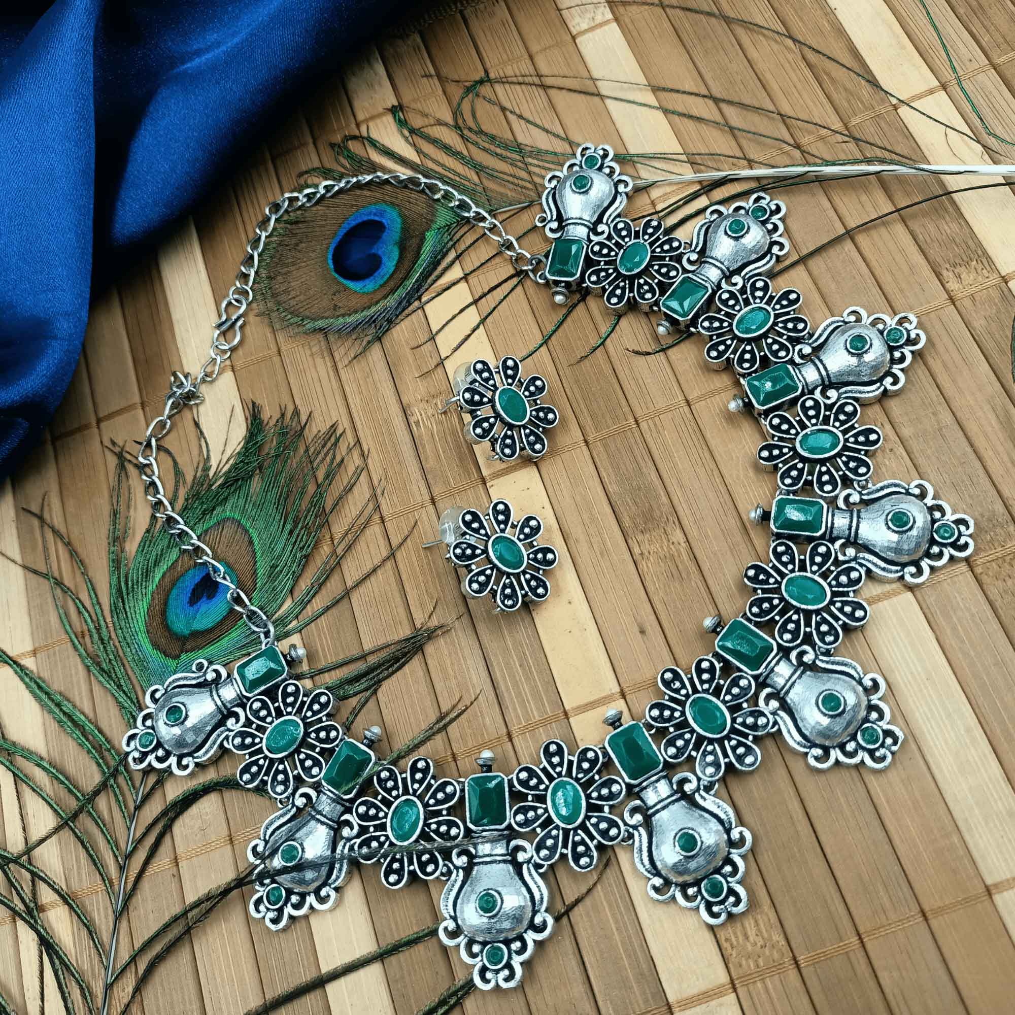 Oxidised Trible Look Green Color chokar Necklace Set with Pearl and Stud Earrings
