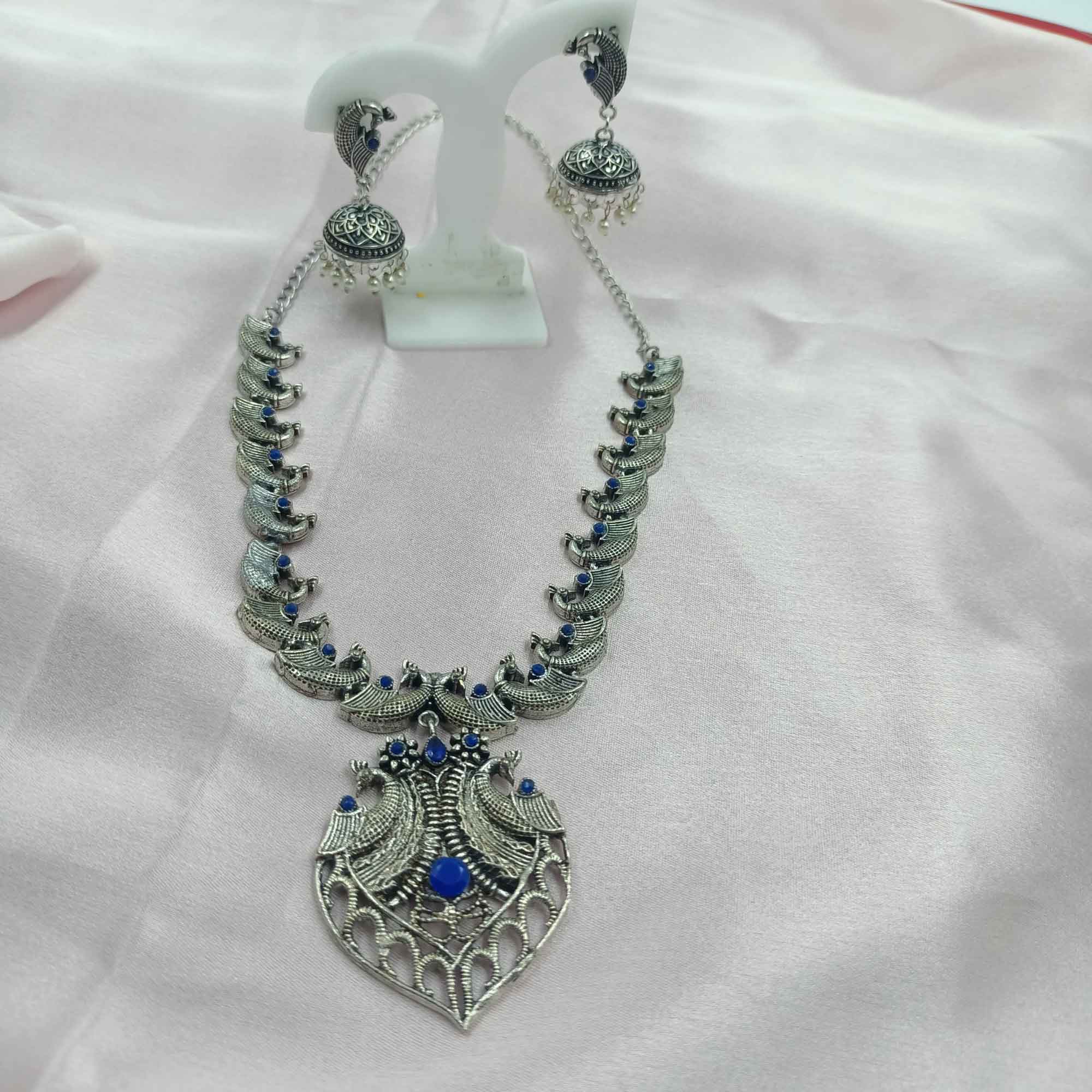 Glamorous Oxidized Silver Look Blue color Necklace Set with Earrings