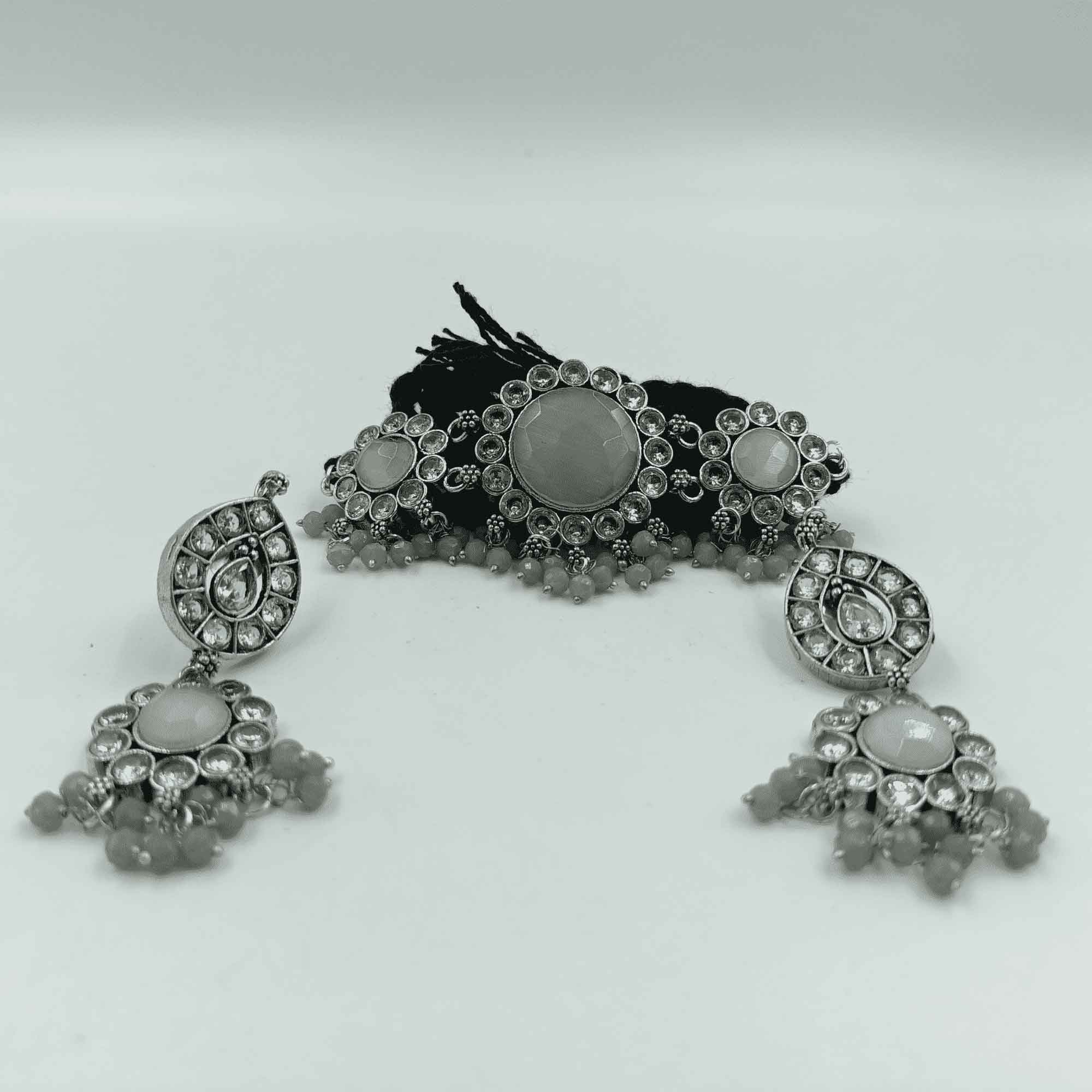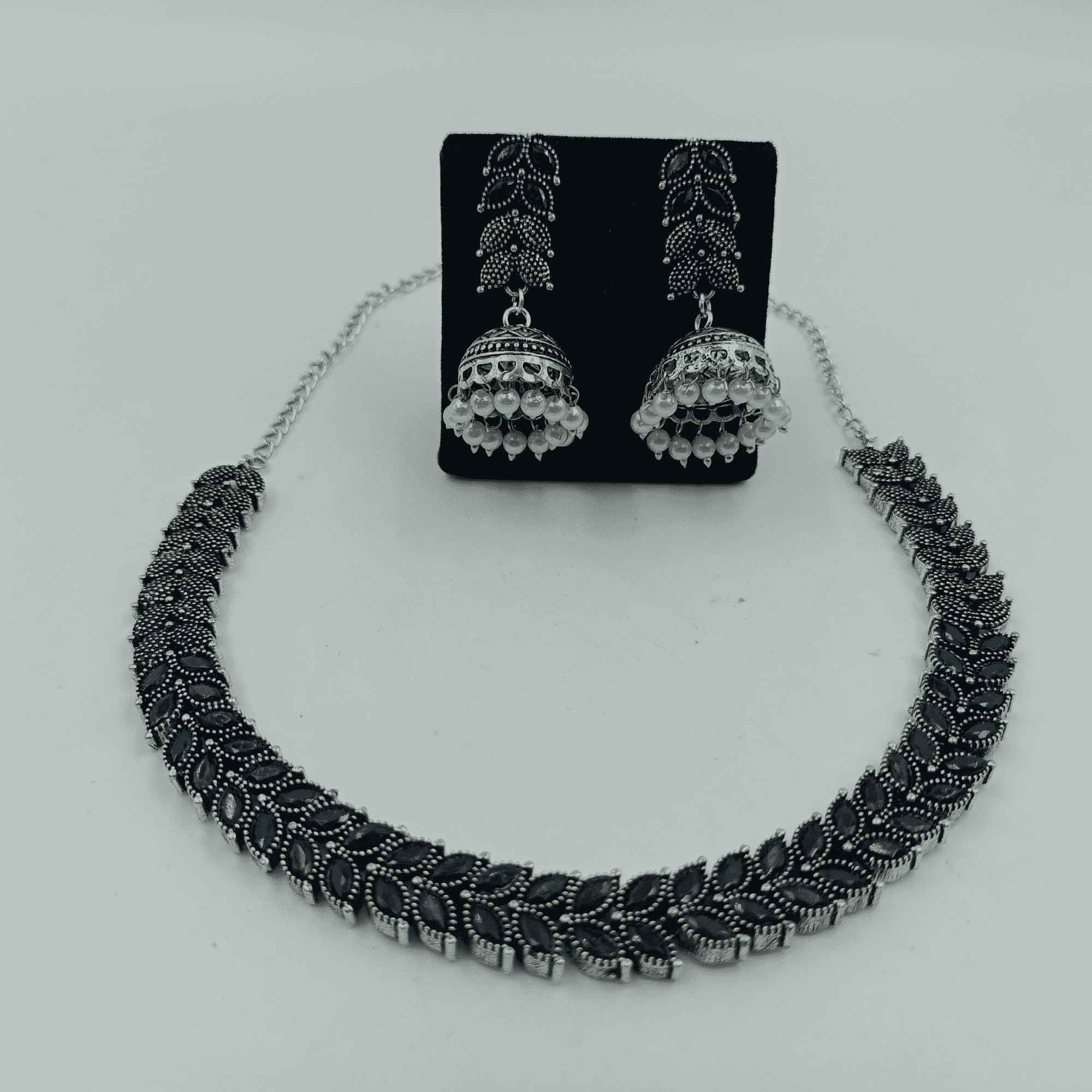 Timeless Elegance Silver Oxidized Black Color Chokar Necklace Set with Zhumki