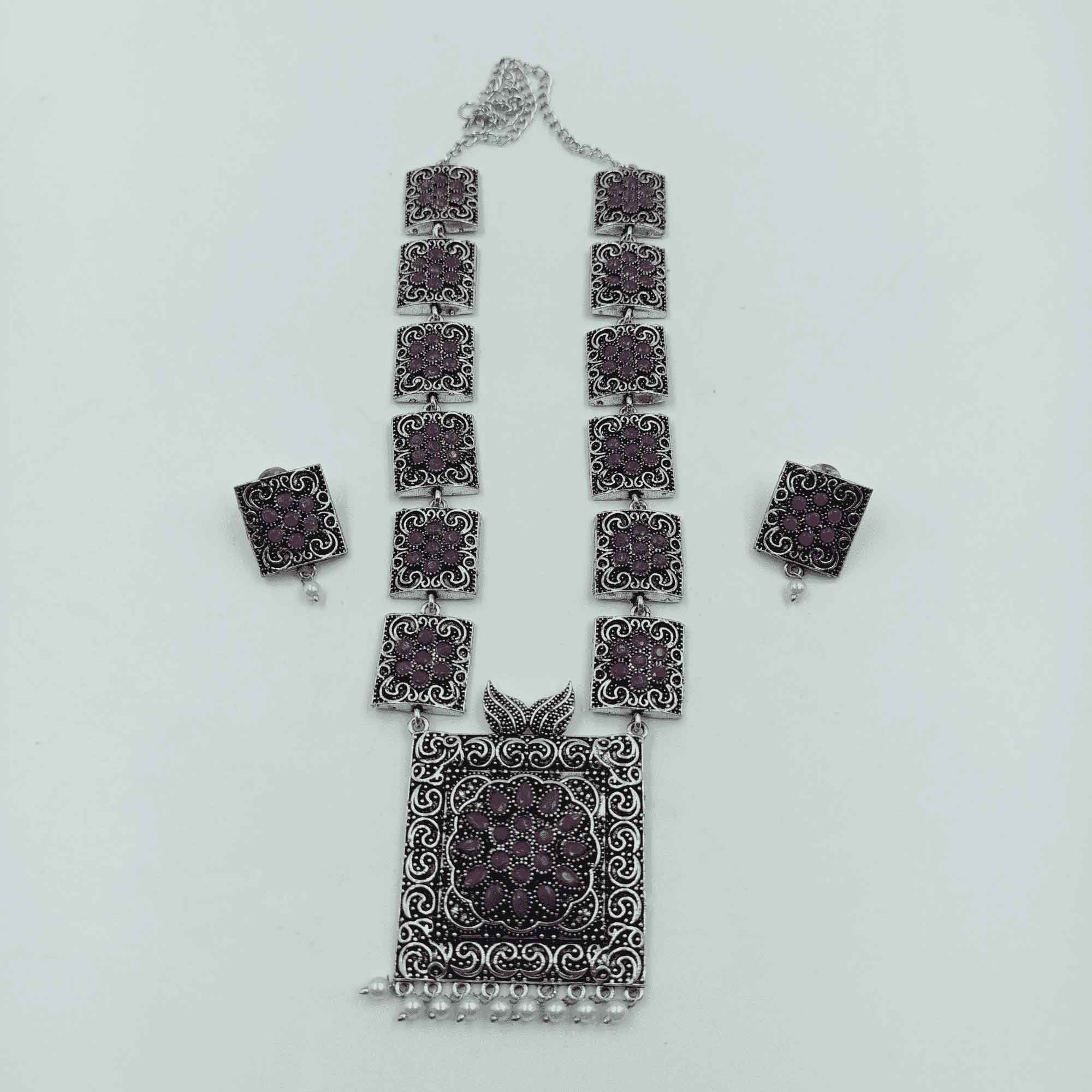 Vintage Charisma Oxidized Silver Look Long Rani Color Necklace Set with Earrings