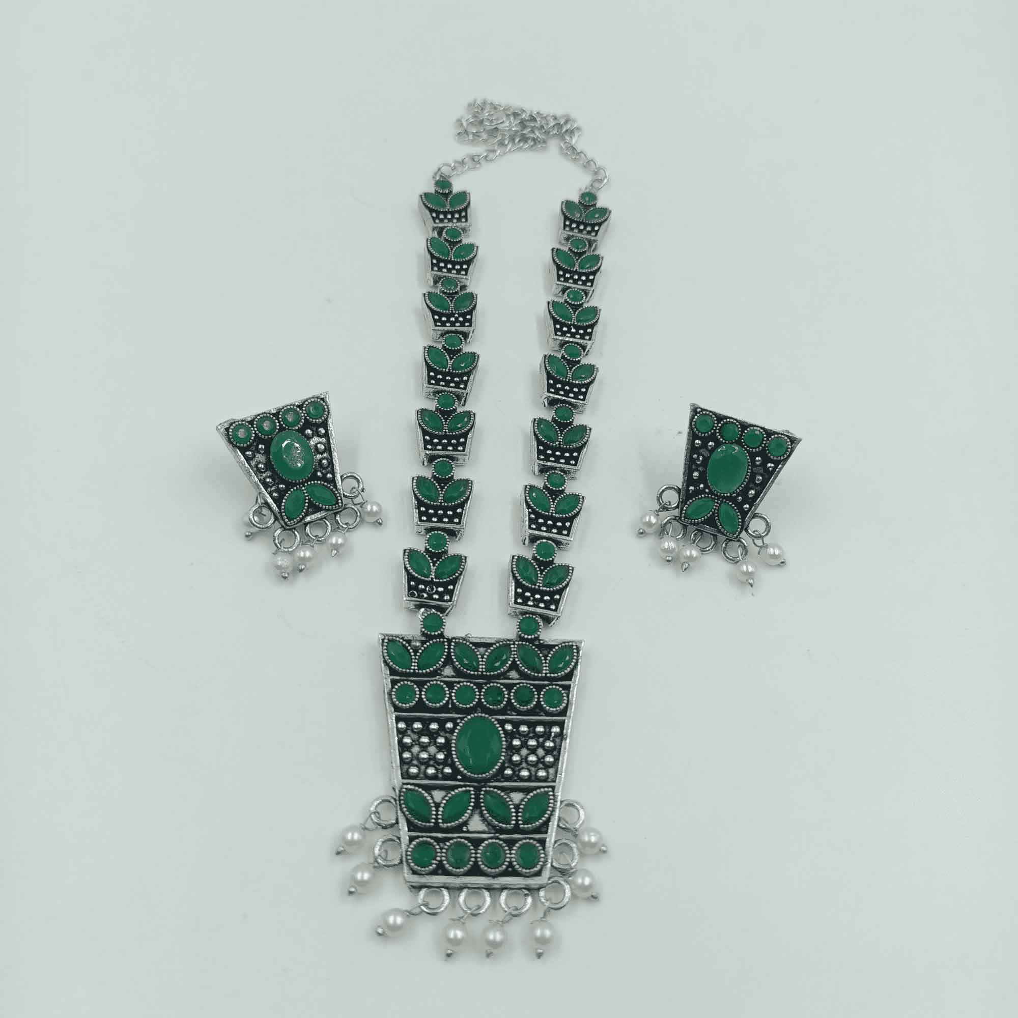 Ethereal Aura Silver Look Oxidized Green Color Long Necklace Set