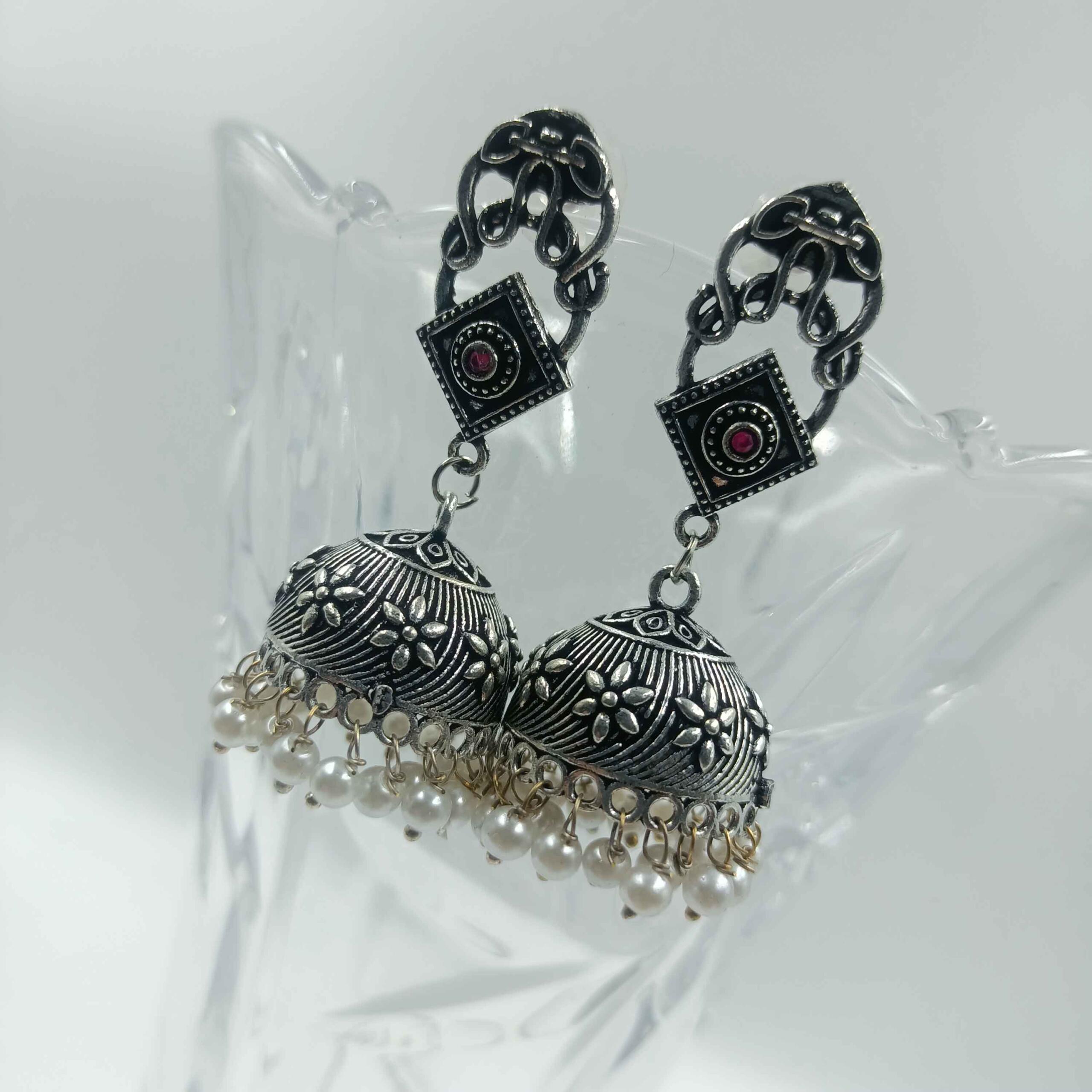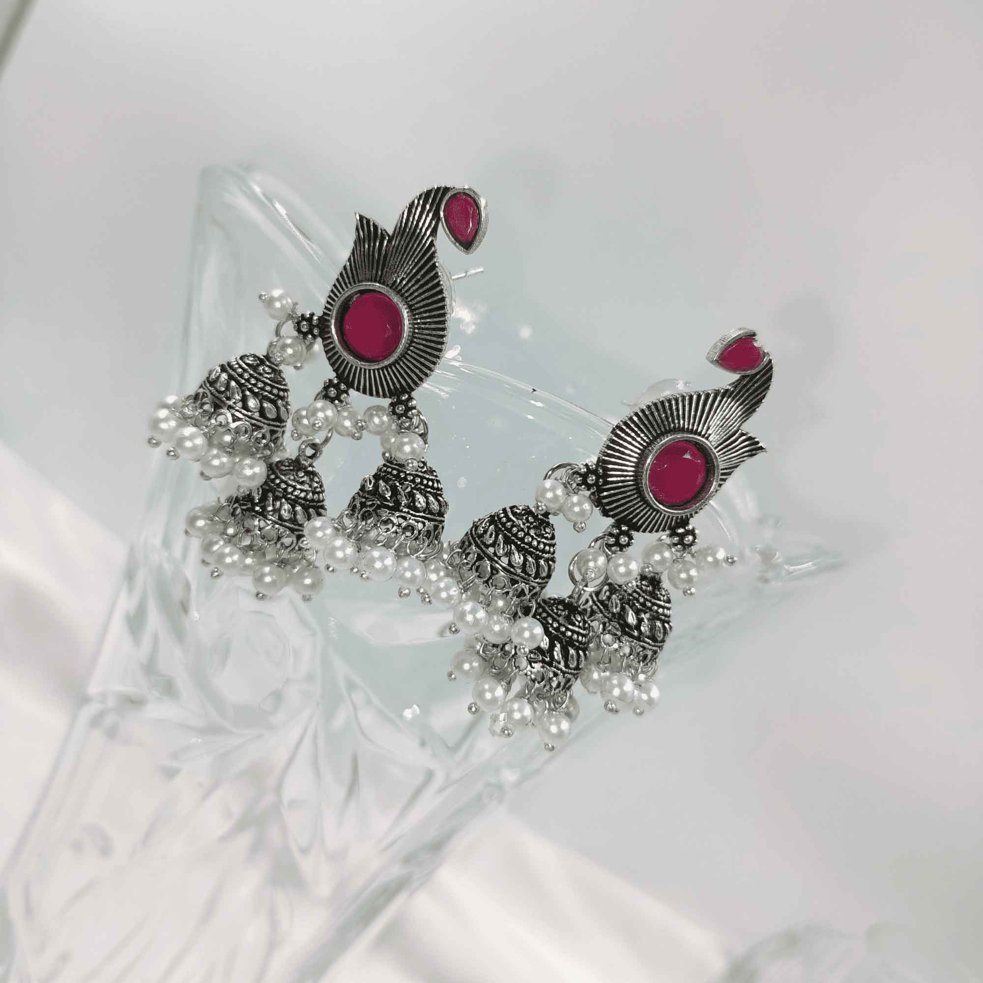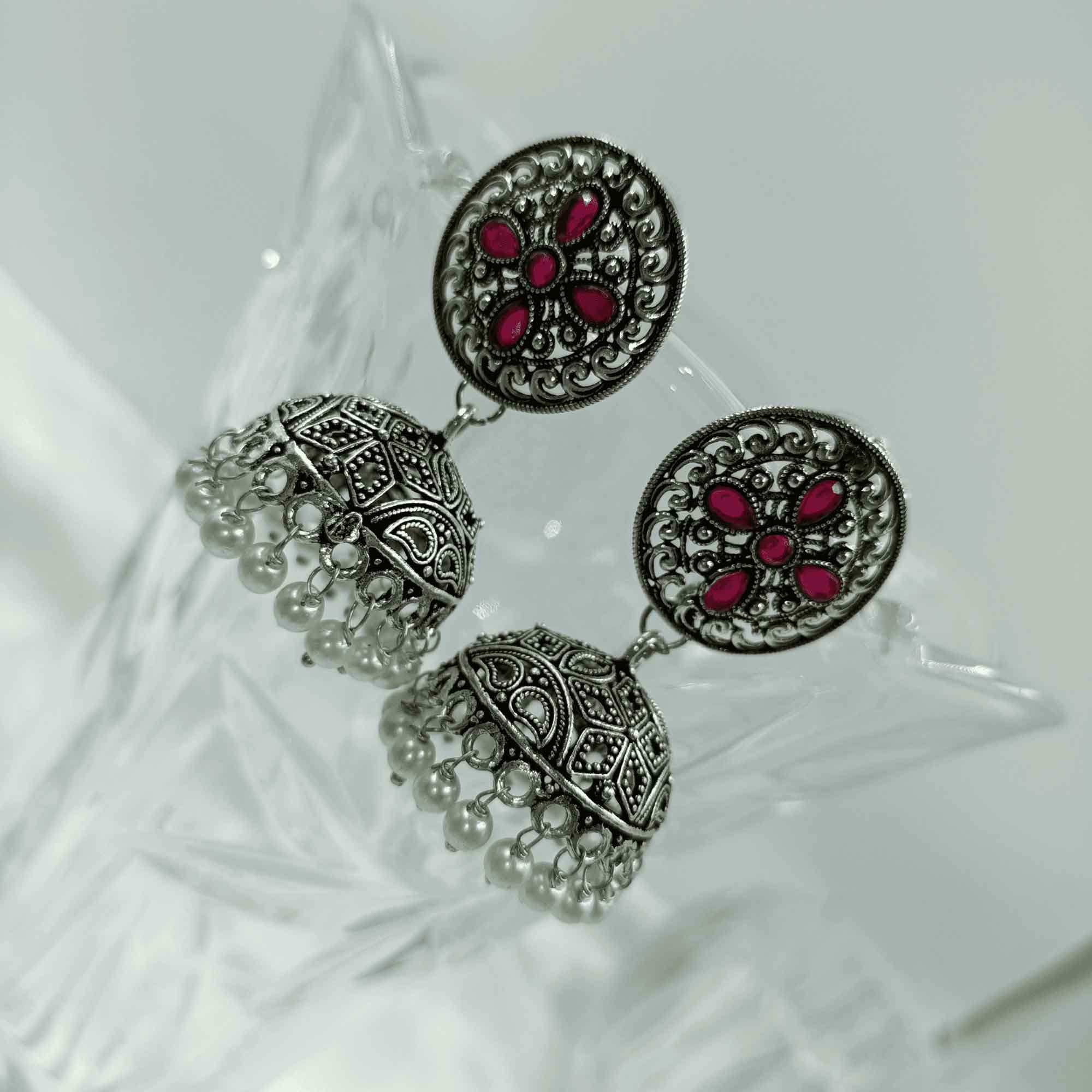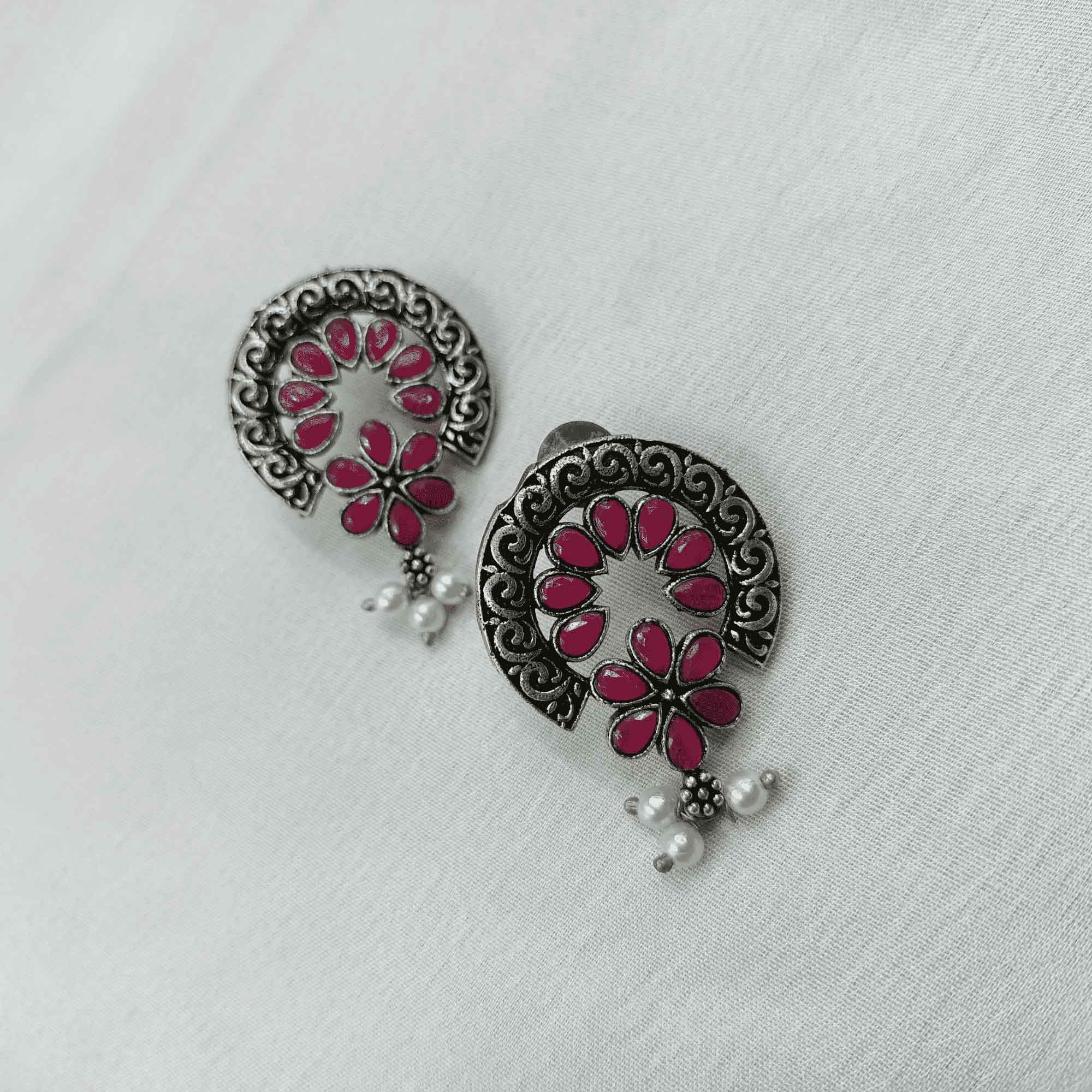 Ethereal Glow Silver Oxidized Red Color Dangler Earrings