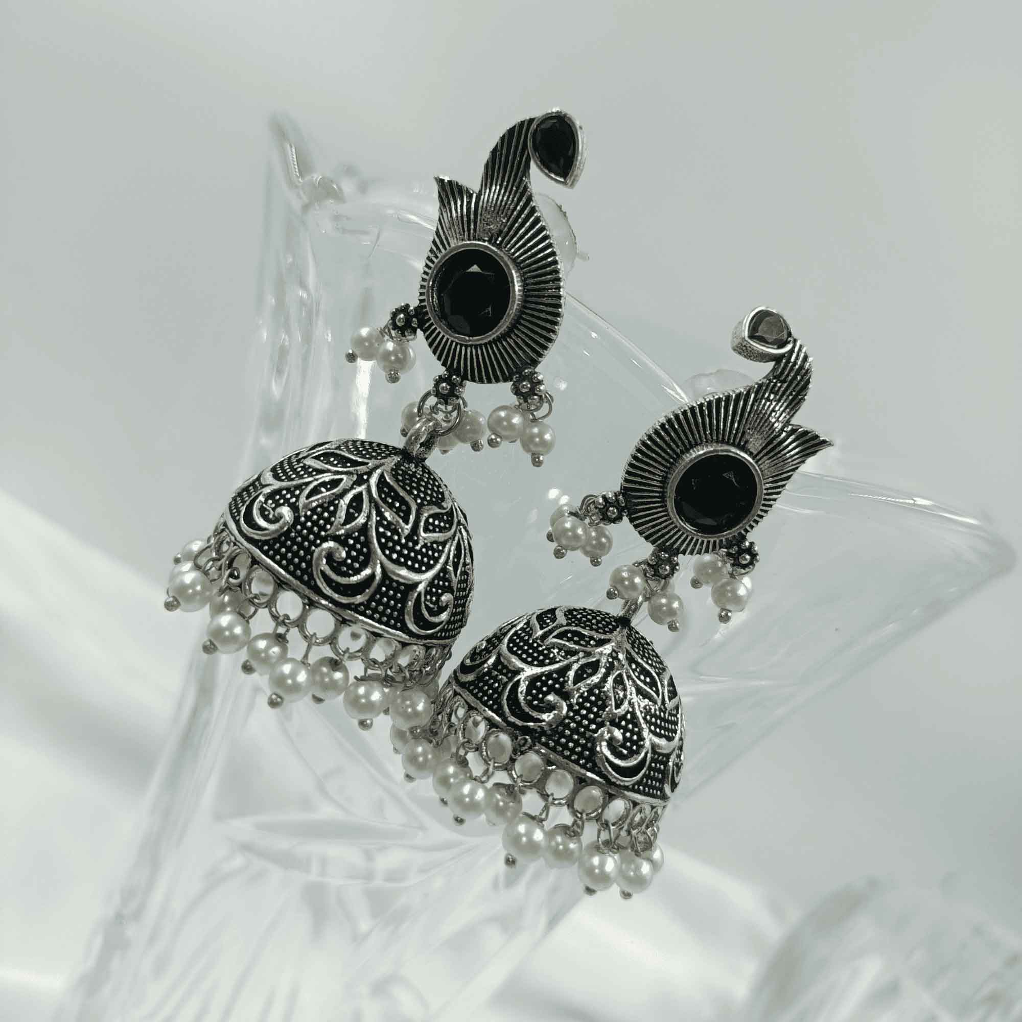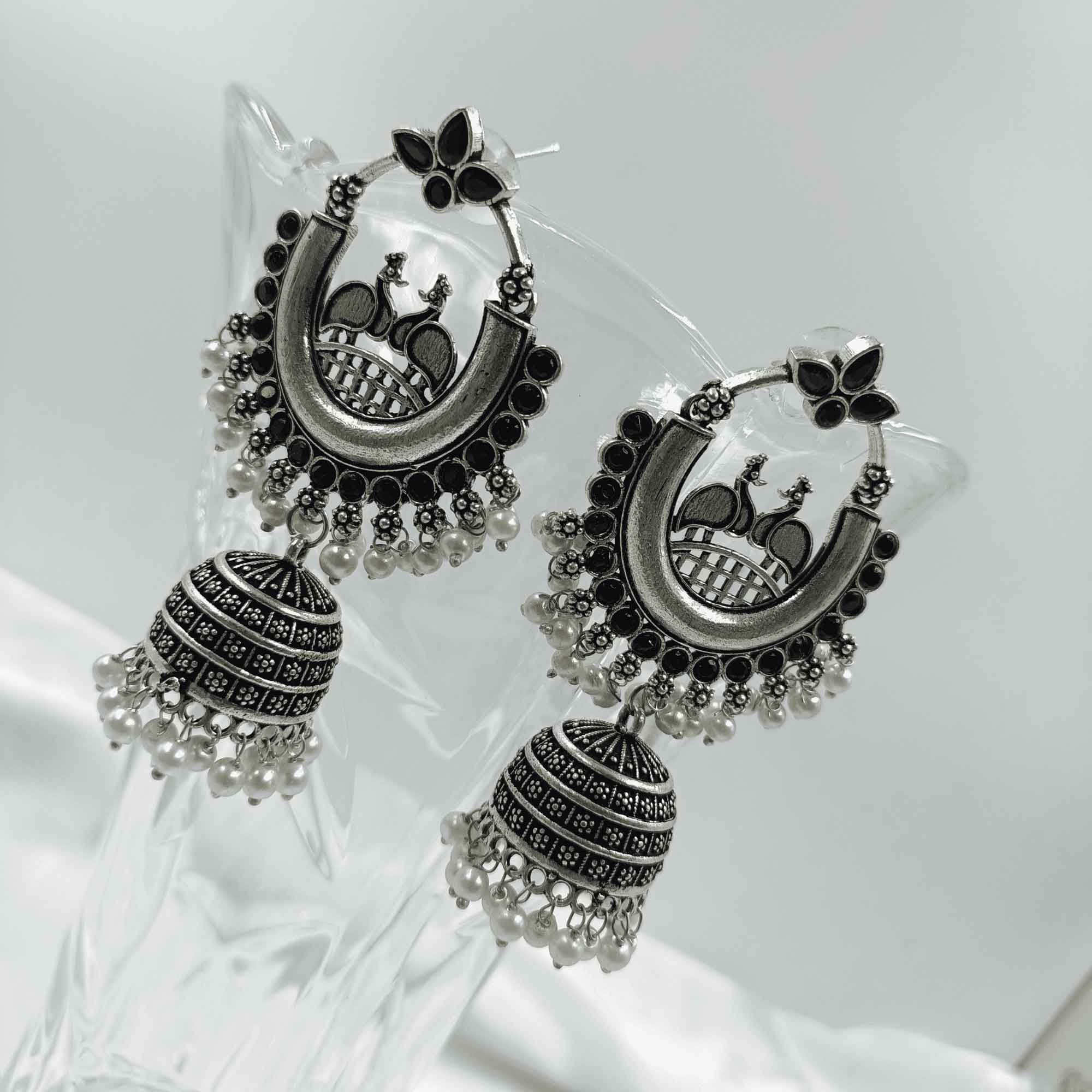 Radiant Oxidized Silver look Black Color Zhumki Chandelier Earrings