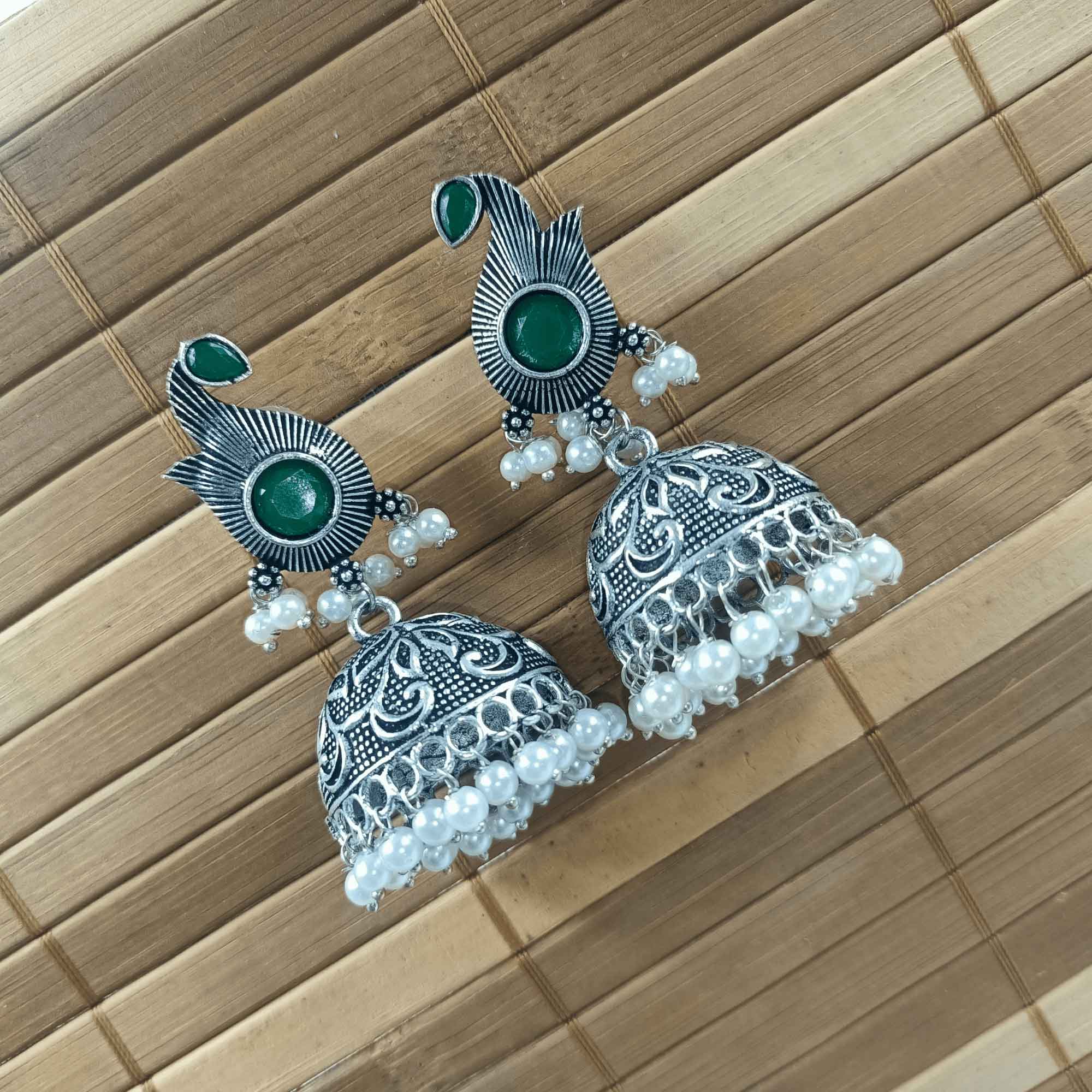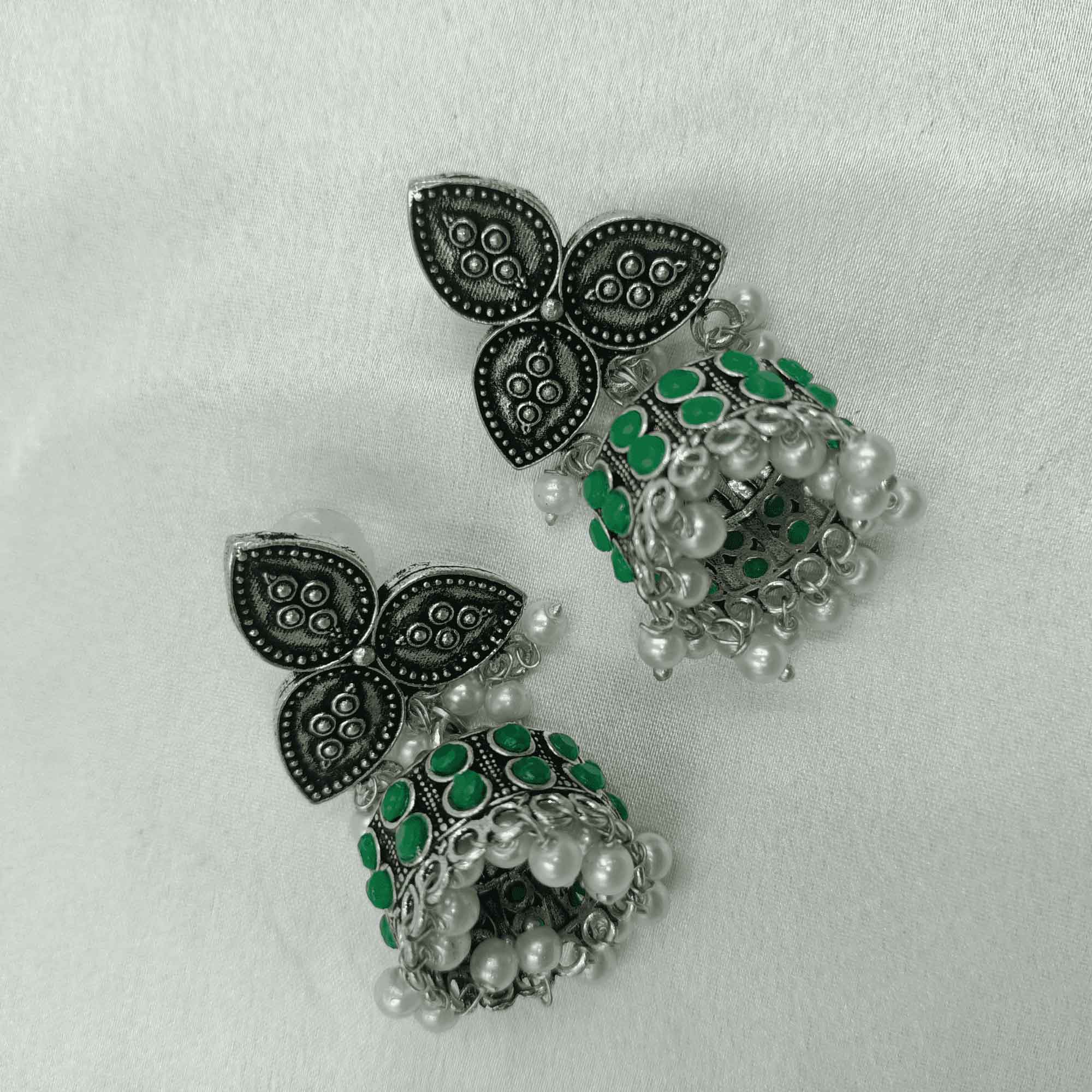 Radiant Oxidized Silver look Green Color Zhumki Chandelier Earrings