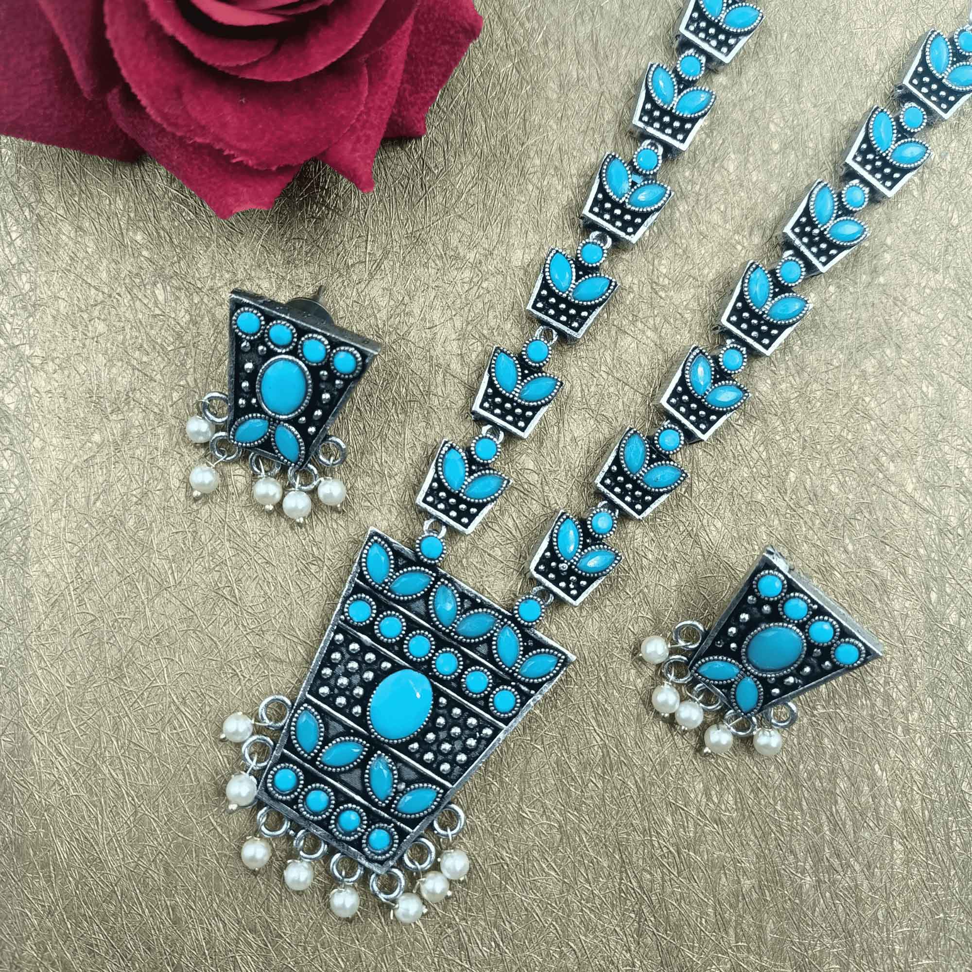 Ethereal Aura Silver Look Oxidized Turquoise Blue Color Long Necklace Set