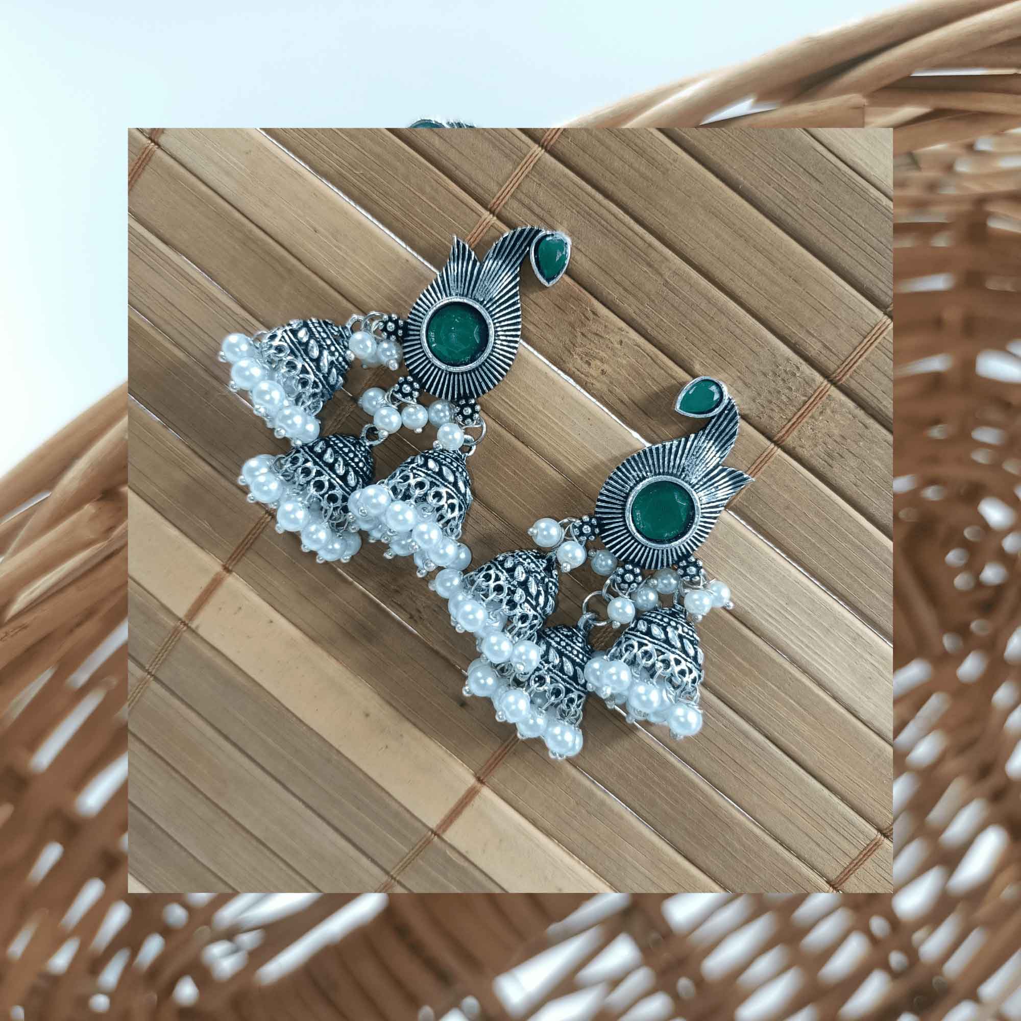 Vintage Silver Cascade Rani & Green Color Chandelier Zhumki Earrings