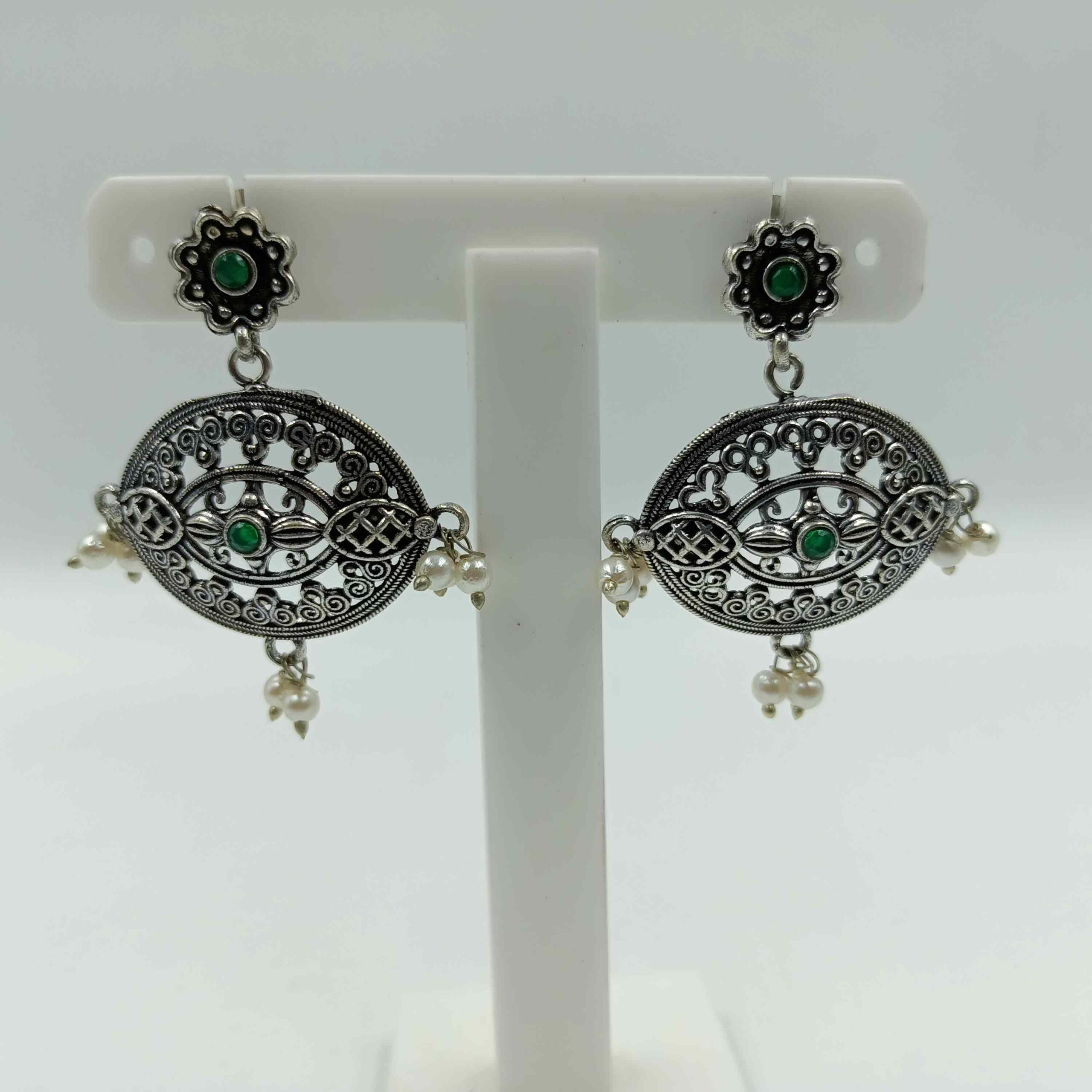 Oxidised Silver Green Chandlier Earrings with Pearl