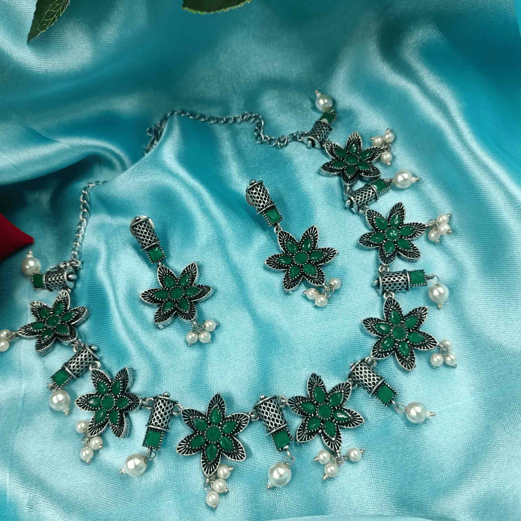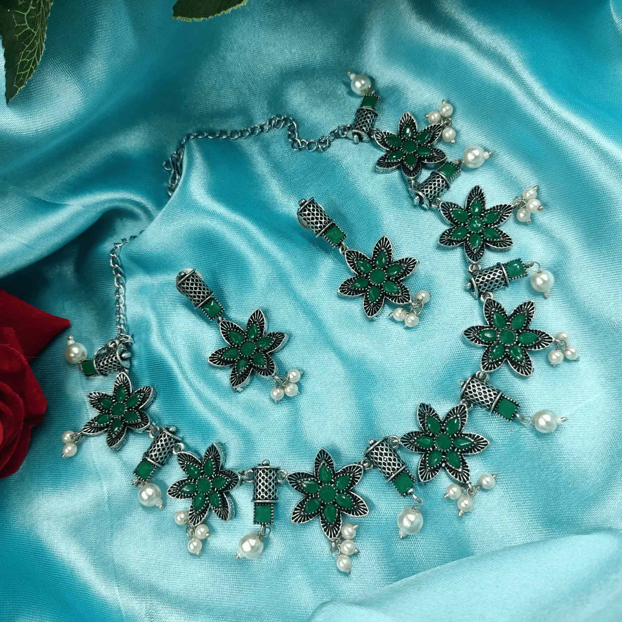 1.This oxidized silver look Chokar necklace set is a stunning addition to any jewelry collection. The set features a beautiful necklace and matching Zhumki earrings with intricate designs that showcase the oxidized silver finish.