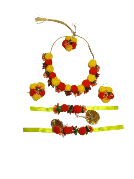 Flower jewelry sets with Mangteeka, finger ring and two flower bangles. Appropriate for party, festive and wedding occasions