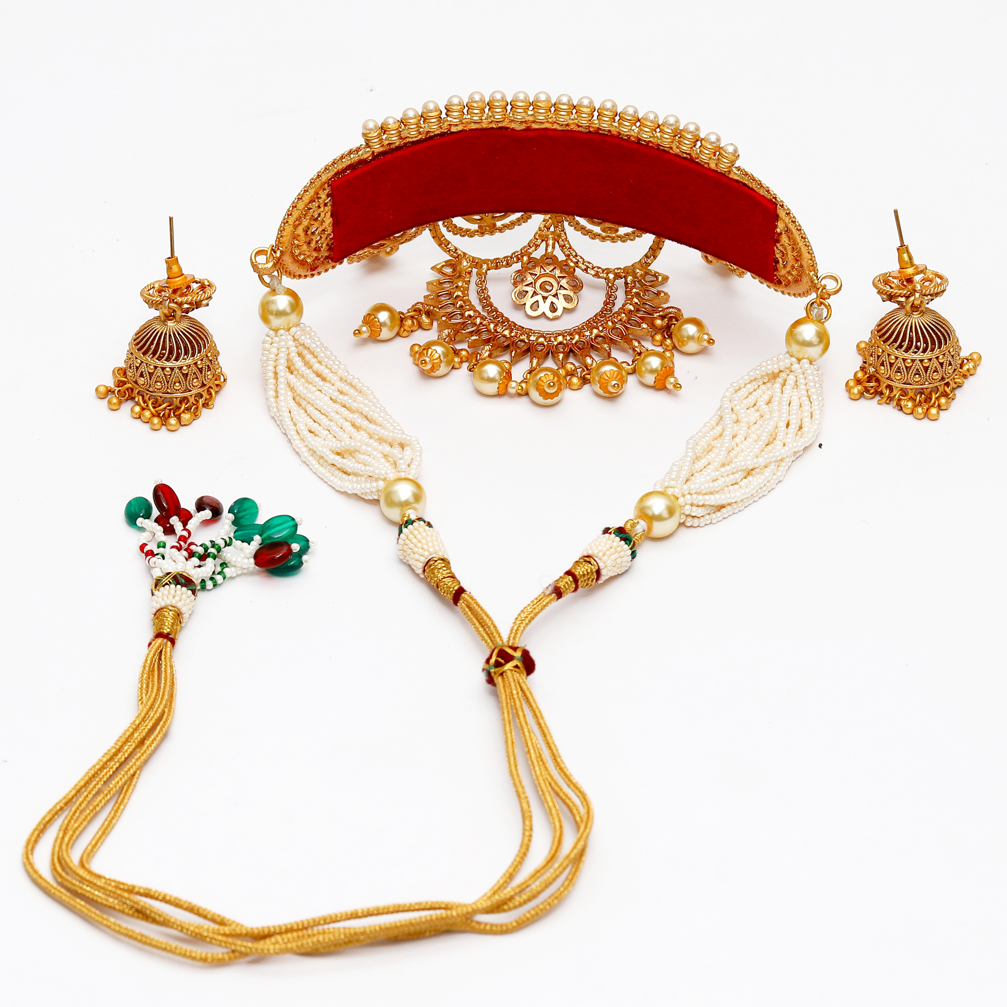 1. This necklace set is handcrafted from gold-plated brass, stones and beads. It consist of a necklace with matching earing. The dori or chain attachment shown in the image is only indicative. It may vary of color and design.