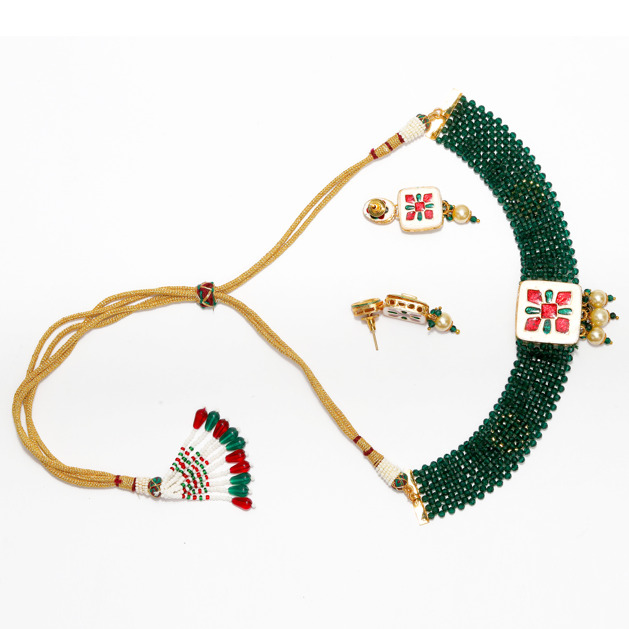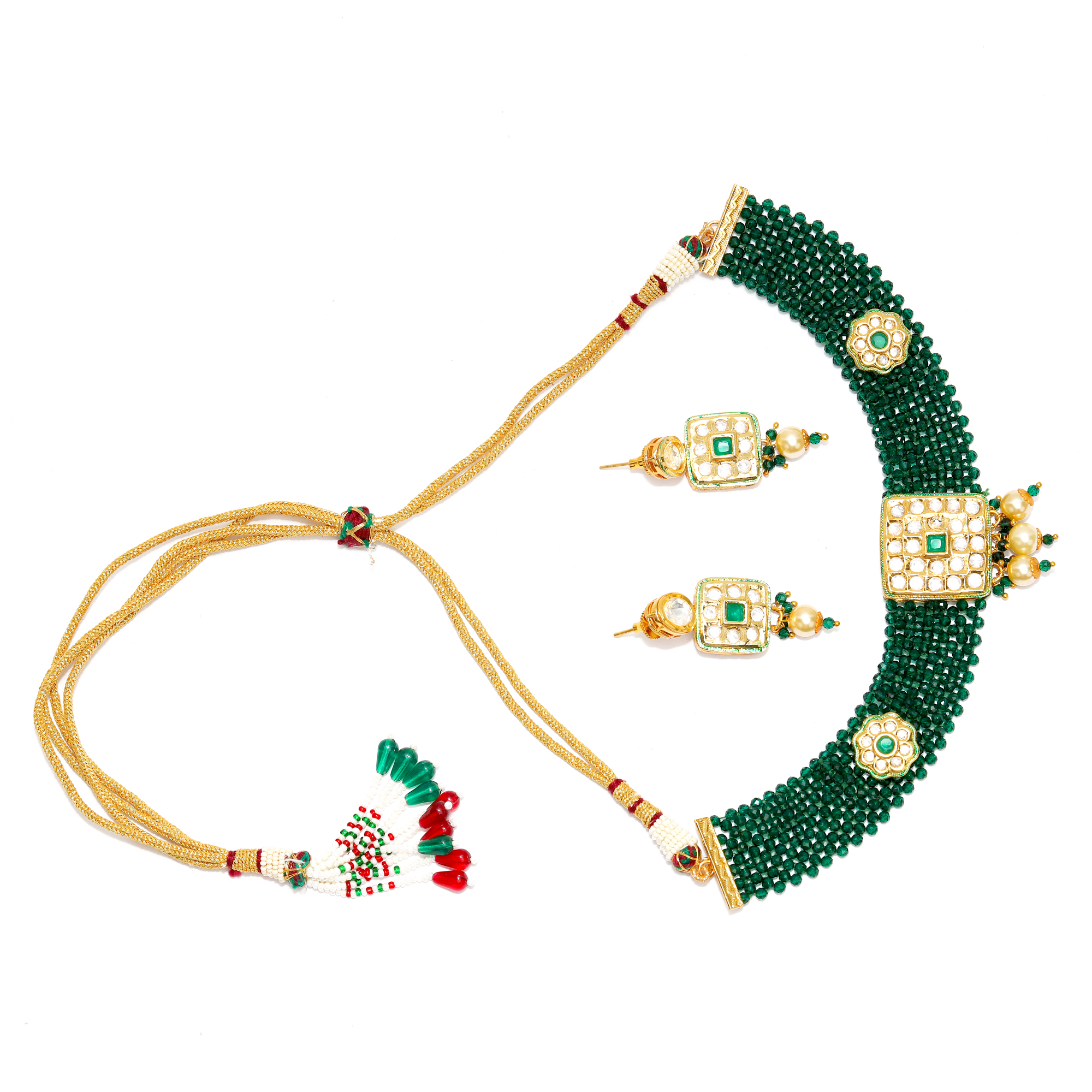 1. This necklace set is handcrafted from gold-plated brass, stones and beads. It consist of a necklace with matching earing. The dori or chain attachment shown in the image is only indicative. It may vary of color and design.