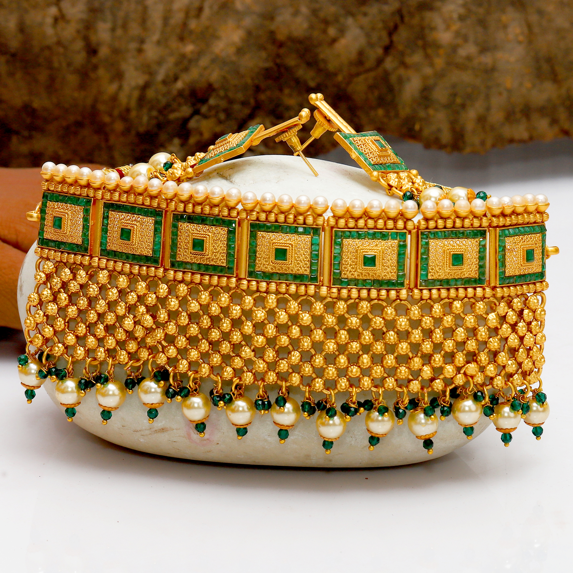 1. This necklace set is handcrafted from gold-plated brass, stones and beads. It consist of a necklace with matching earing. The dori or chain attachment shown in the image is only indicative. It may vary of color and design.