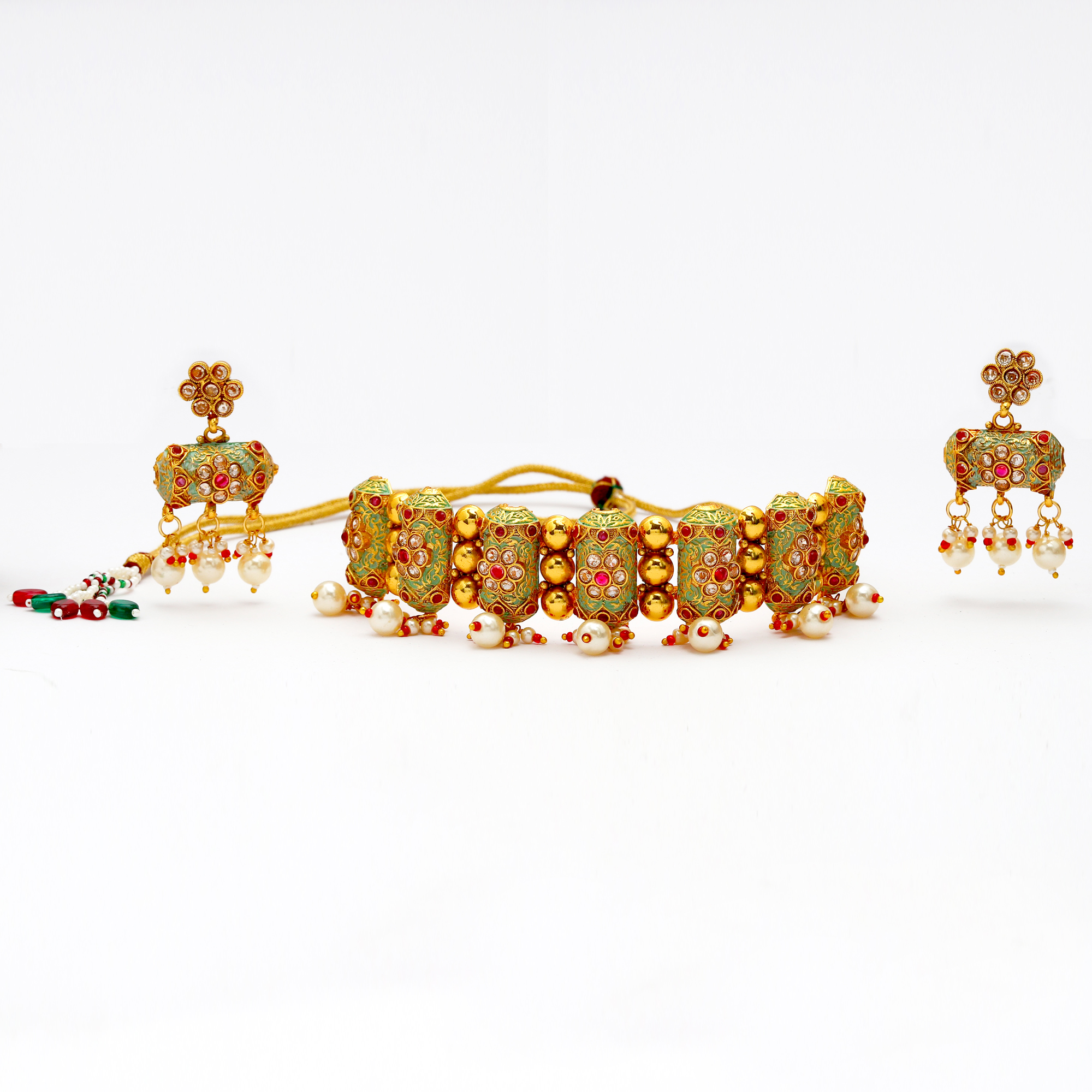 Gold Kundan Chokar Necklace Set with Meenakari & Earrings