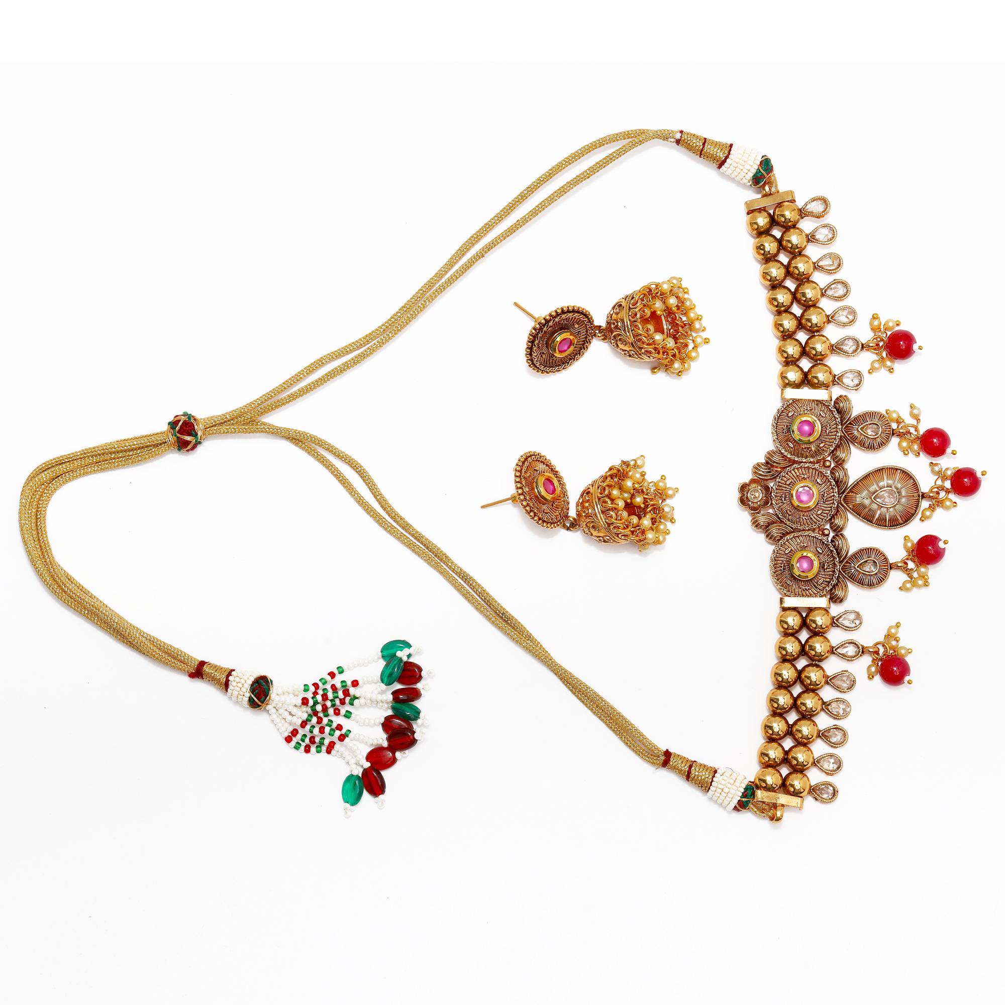 1. This necklace set is handcrafted from gold-plated brass, stones and beads. It consist of a necklace with matching earing. The dori or chain attachment shown in the image is only indicative. It may vary of color and design.