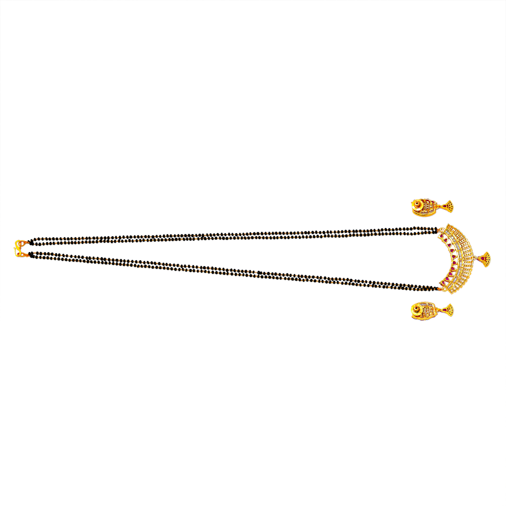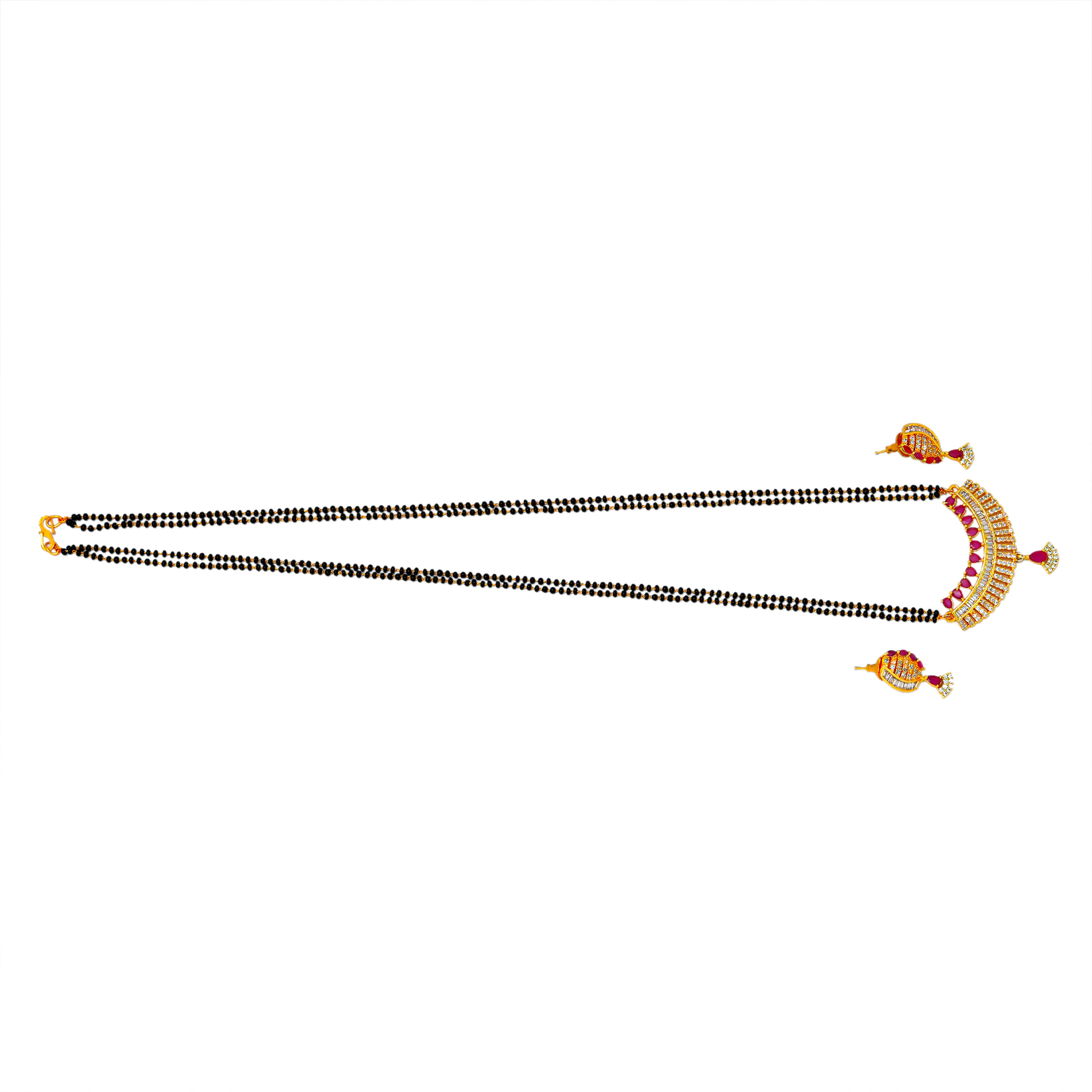 * This long Mangalsutra pendent set with stud earrings is handcrafted in gold-plated brass, stones and American Diamond. The dori or chain attachment shown in the image is only indicative. It may vary of color and design.