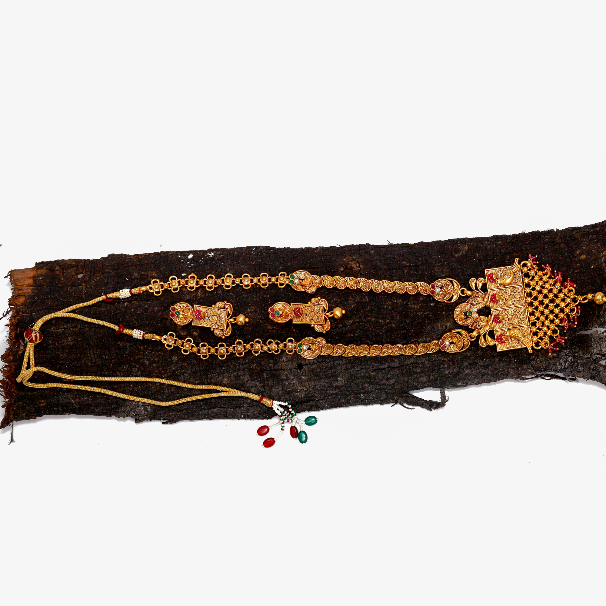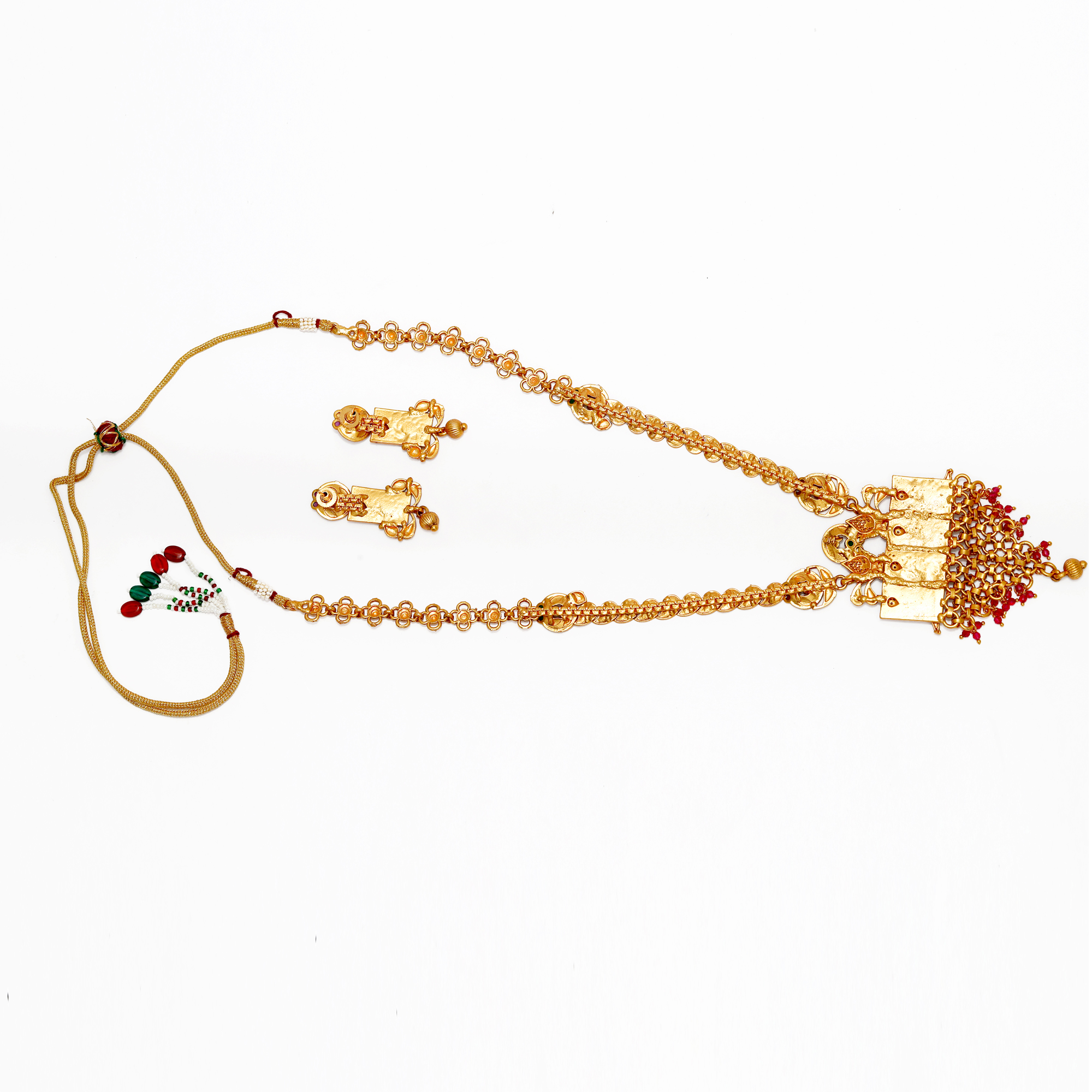 1. This necklace set is handcrafted from gold-plated brass, stones and beads. It consist of a necklace with matching earing. The dori or chain attachment shown in the image is only indicative. It may vary of color and design.