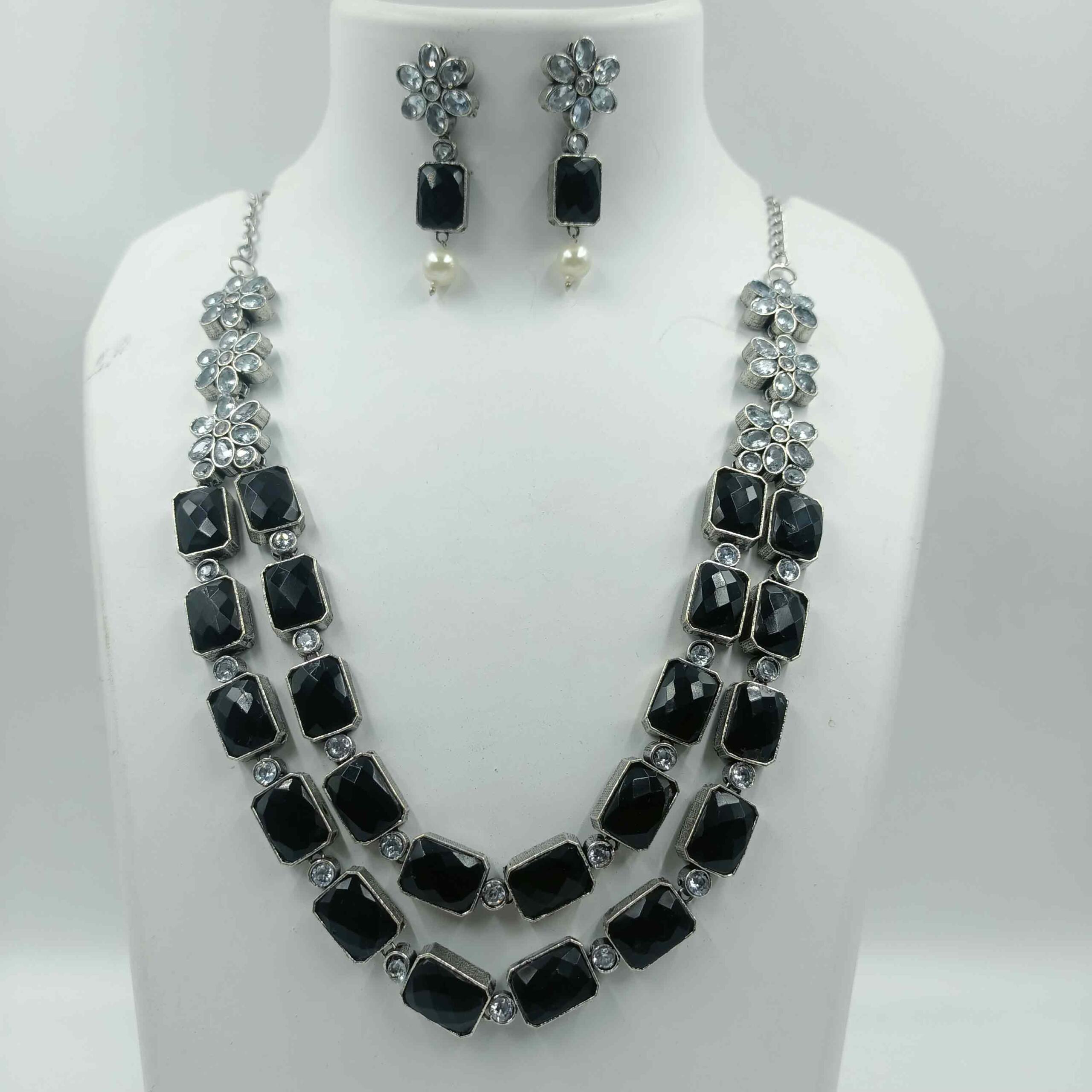 1. This elegent Black color Long Necklace Set with Pearl Beeds and White Stones with Dangler Earrings is made of German silver.It consist of set of two stud earrings.