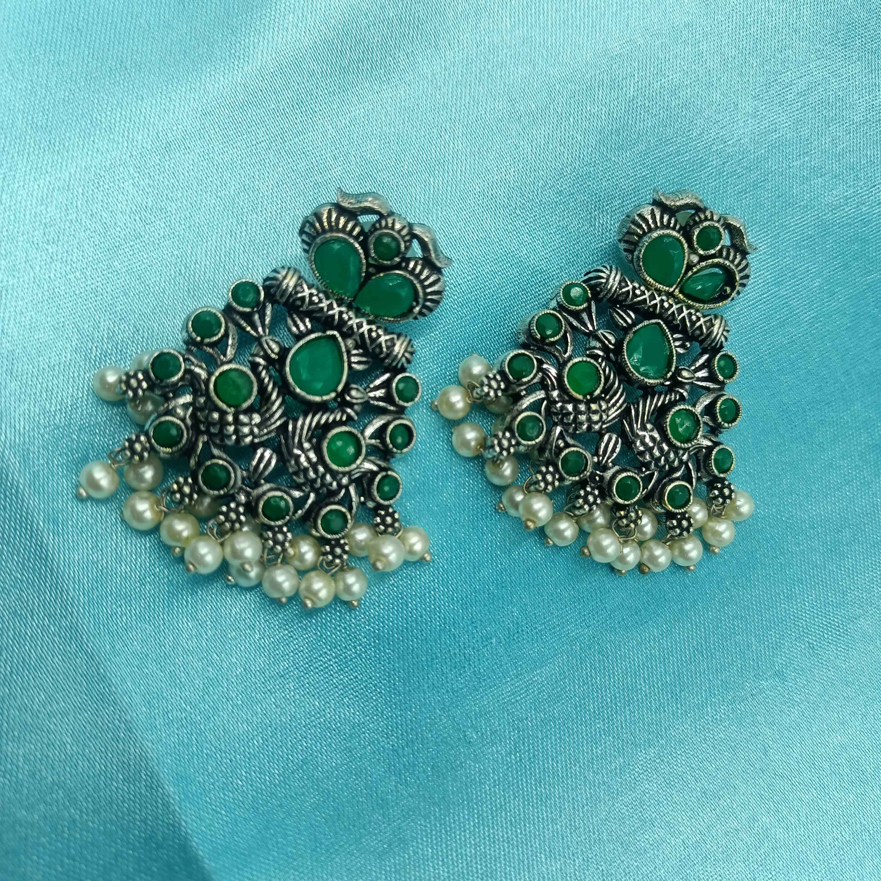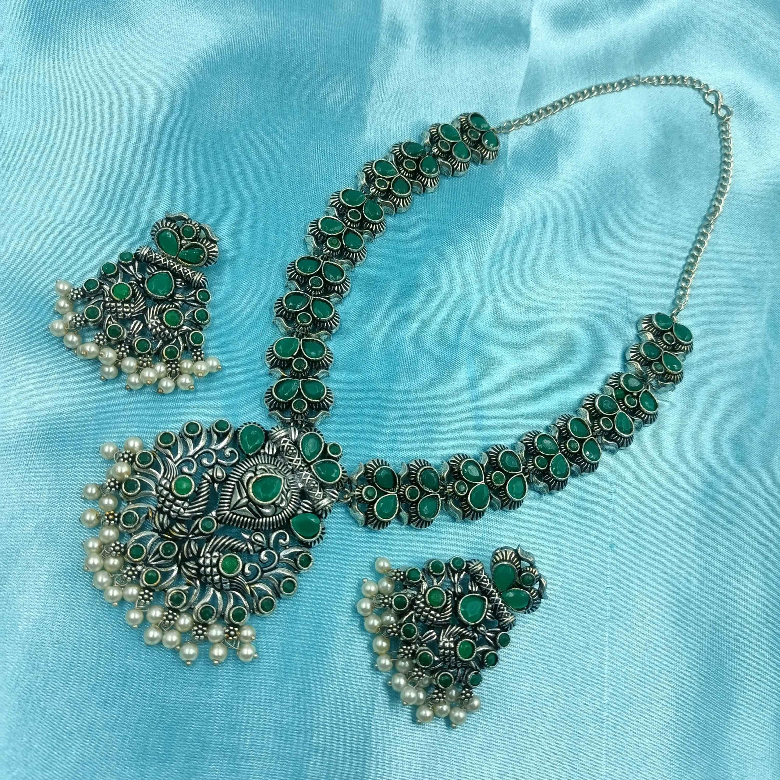 1. This trible look stylish silver look green color long necklace set with dangler Earrings is made of German silver.It consist of set of two dangler earrings.