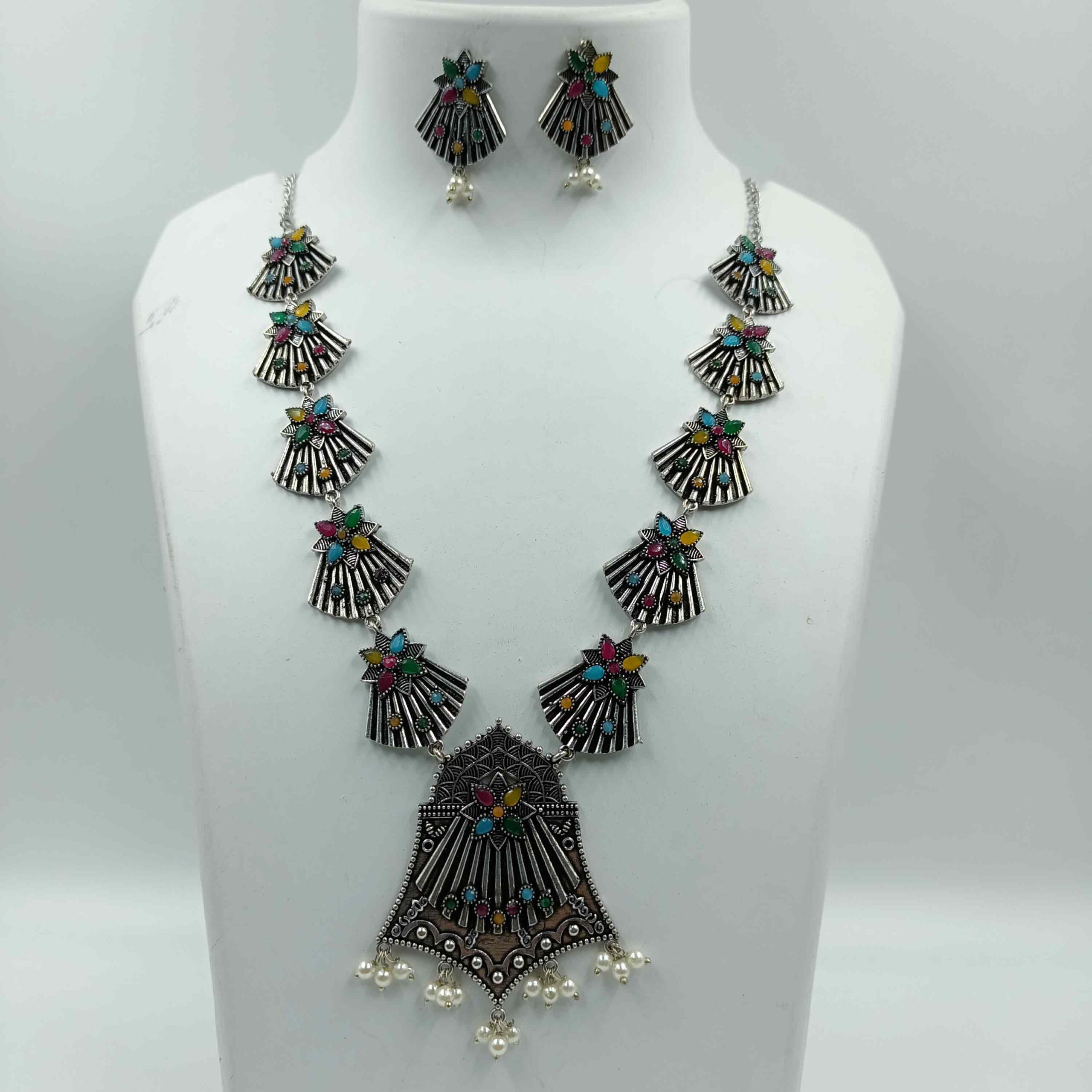 1. This trible look stylish silver look multi color long necklace set with stud Earrings is made of German silver.It consist of set of two stud earrings.
