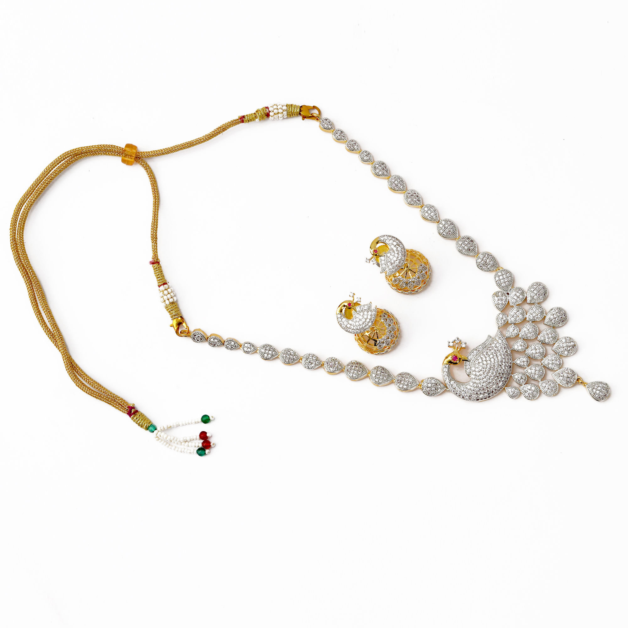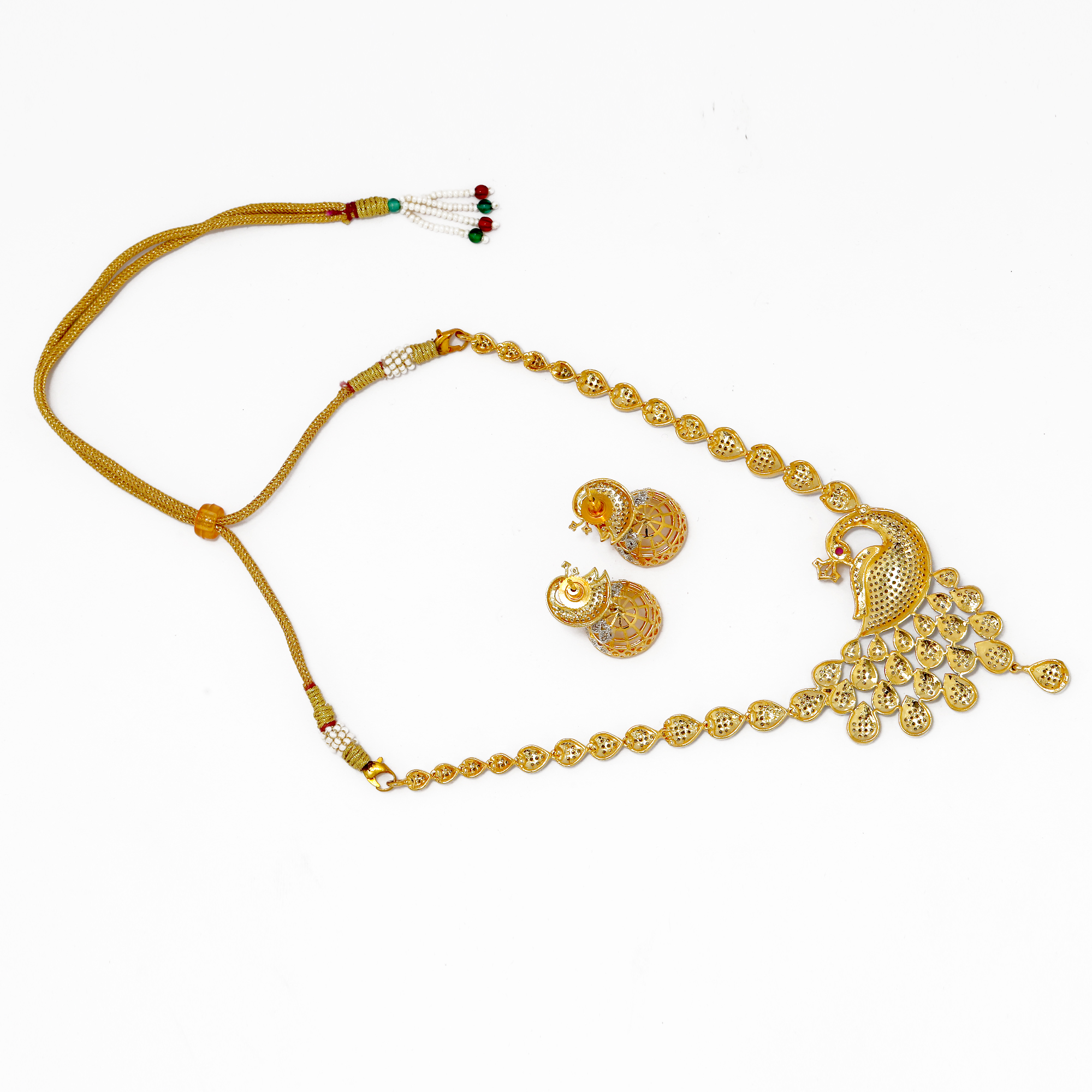 * This gold colour look Peacock Mayur design stunning Necklace set is handcrafted in gold-plated brass, stones and American Diamond. The dori or chain attachment shown in the image is only indicative. It may vary of color and design.