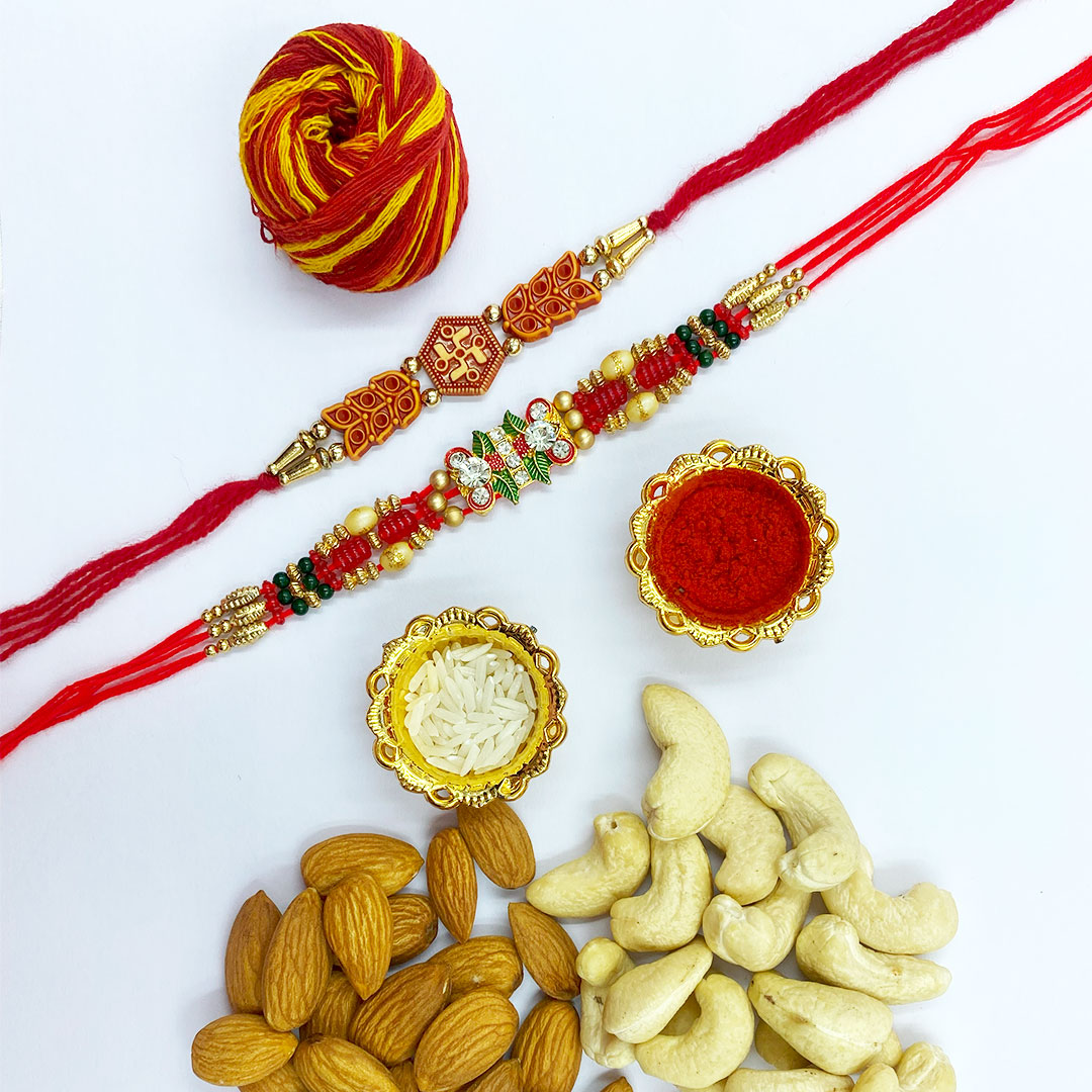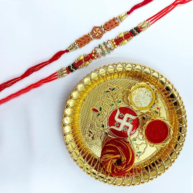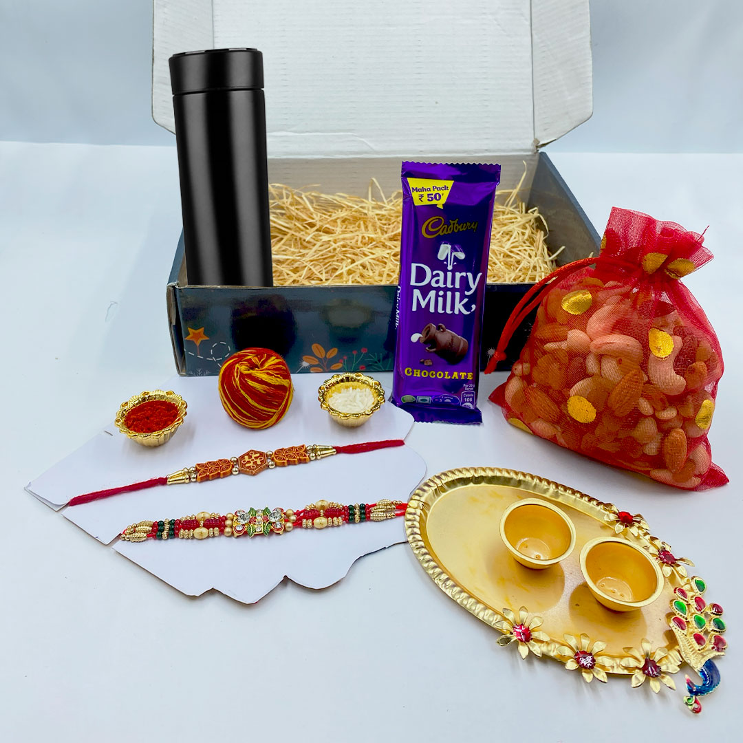 Features a beautiful designer Rakhi set with Puja Thali, Roli, Chawal & festive Chocolate