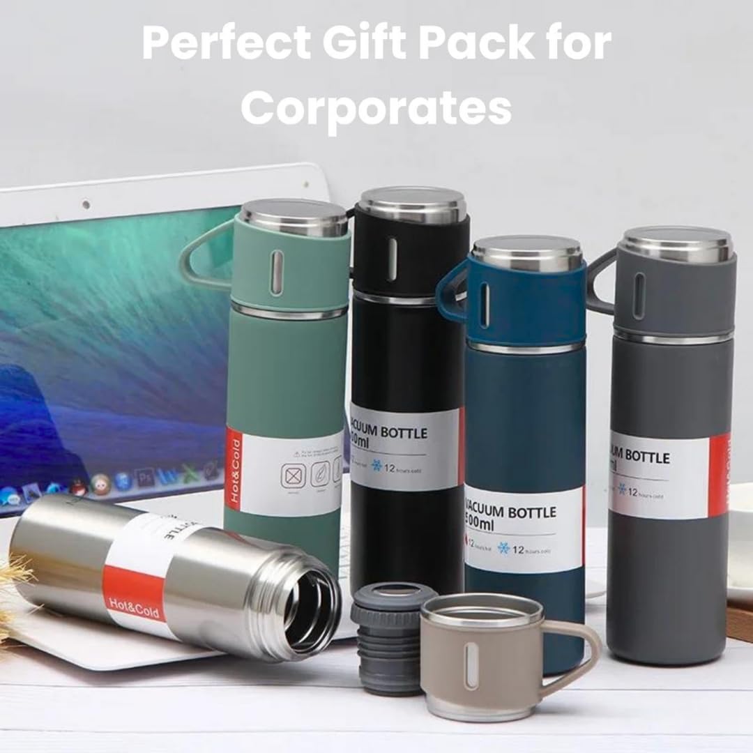 The set includes one vacuum flask and three stylish cups, neatly packed in an elegant gift box. The flask features a leak-proof lid and sturdy handle, ensuring safe and comfortable carrying. Its modern design and premium finish make it an excellent choice for corporate gifting, festive gifts, birthdays, anniversaries, and business promotions.
