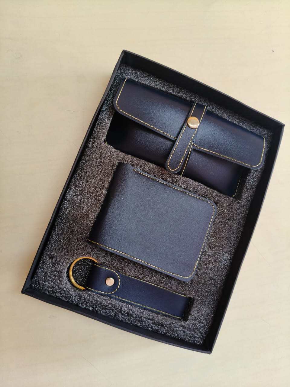 The set includes a stylish leather wallet for daily cash and card storage, a leather sunglasses holder case to protect and organize pens, and a strong leather keychain for easy key management. All items are neatly placed in an elegant gift box, making it ready to gift without any extra packing.