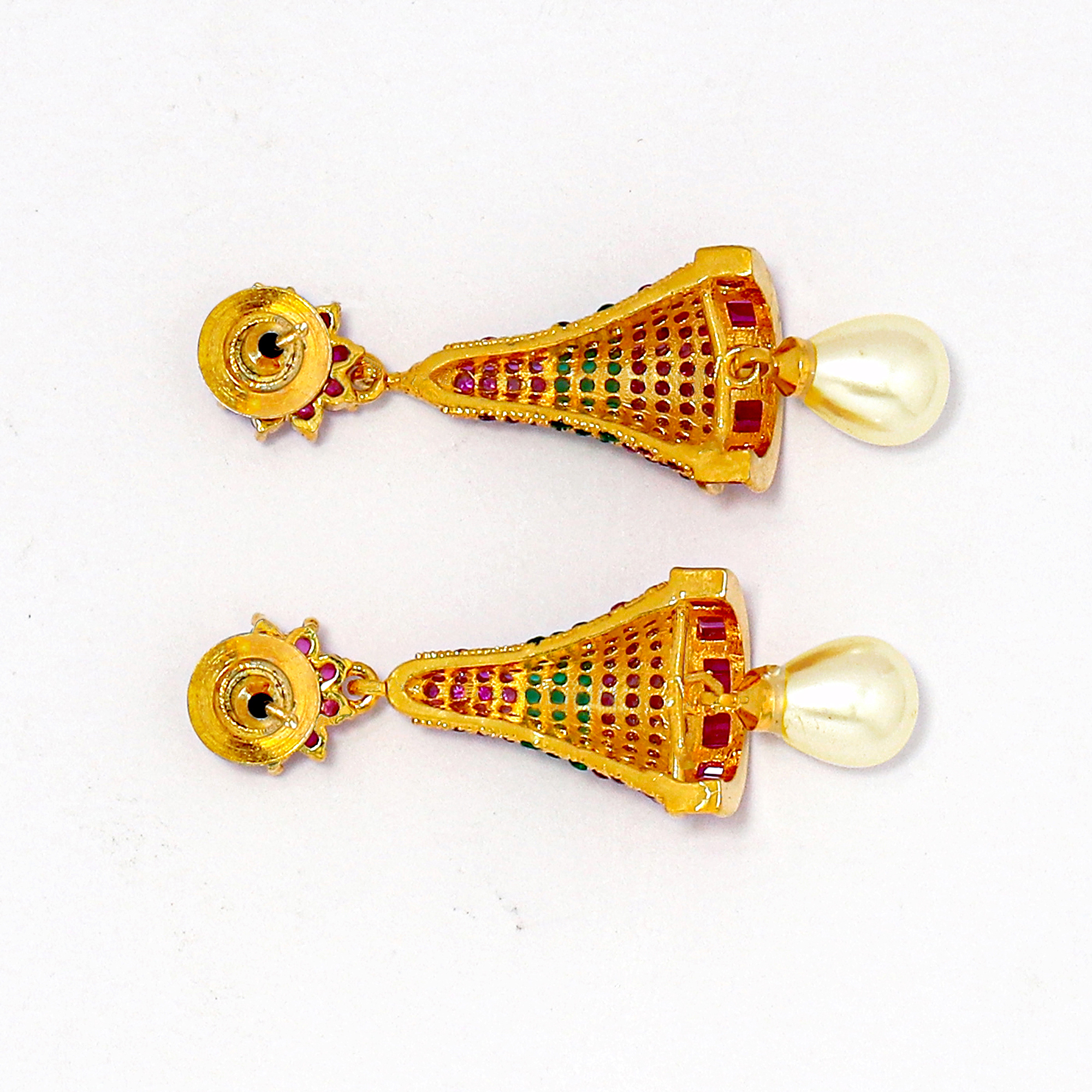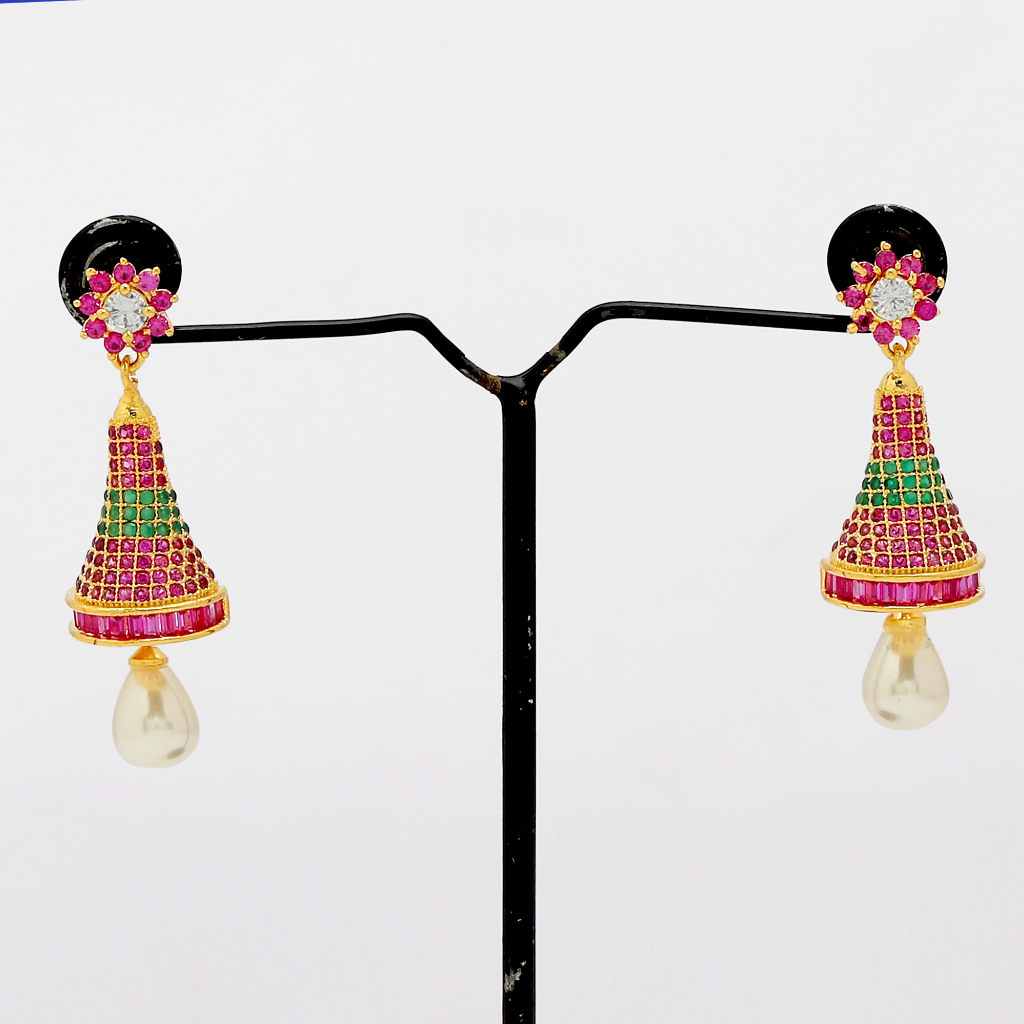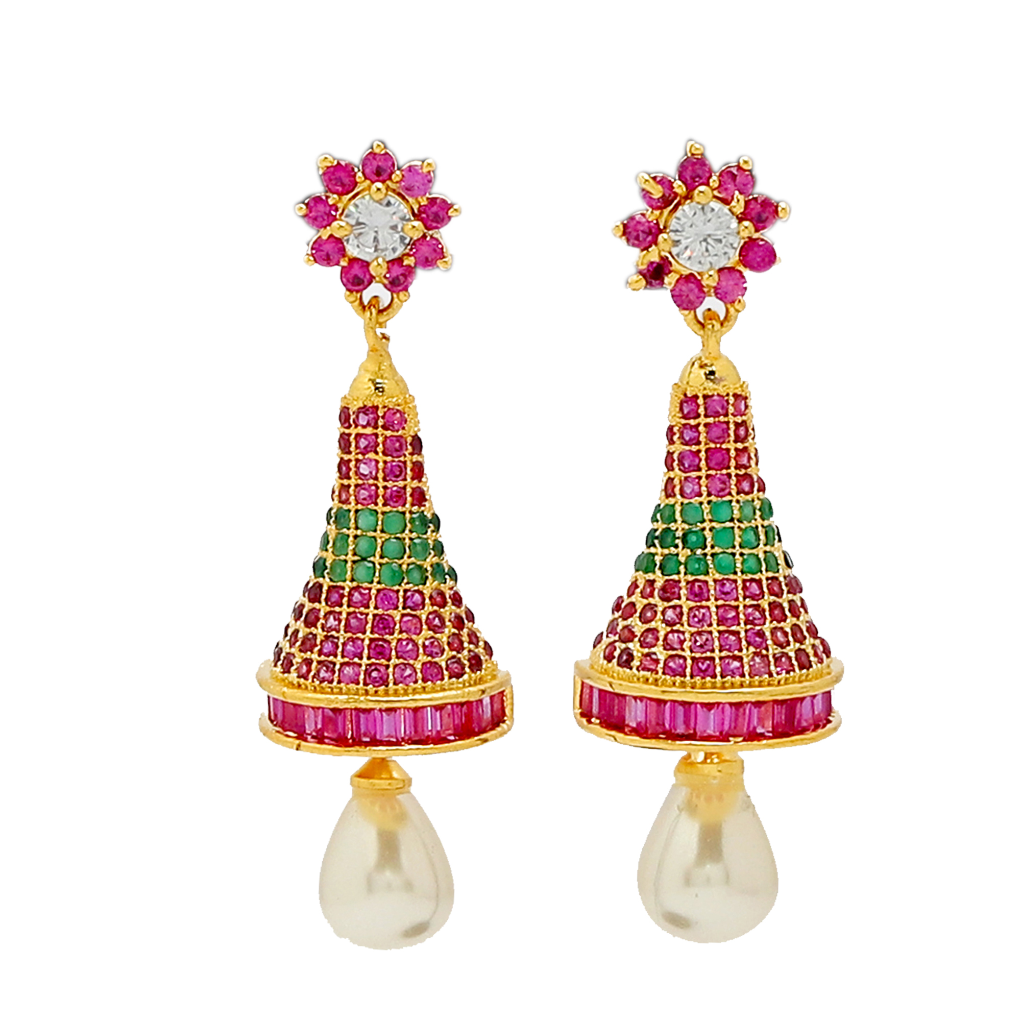 * This Short lenght American diamond Zhumki Earring set is handcrafted in gold-plated brass, stones and American Diamond.