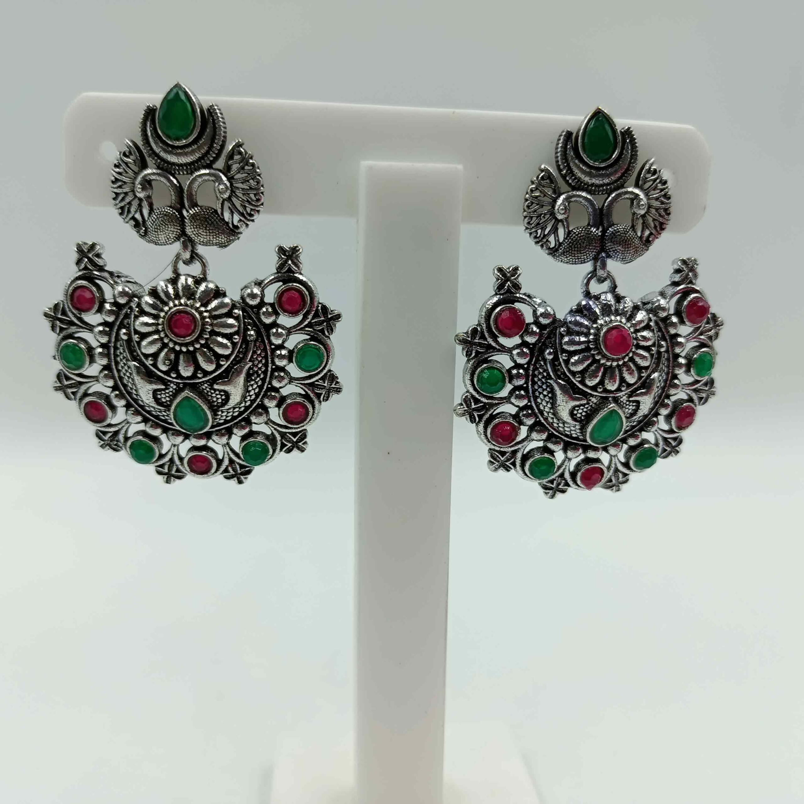 1. This silver look Multi color Red & Green dangler Chandbali Earring is made of German silver and stone.It consist of set of two earrings.
