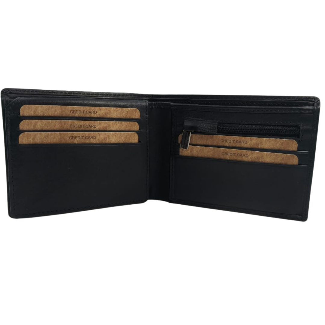 Men’s bi-fold wallet is designed for those who prefer a clean, modern, and highly organized wallet. Crafted in a sleek jet black finish, it features a unique elastic card strap holder that keeps frequently used cards secure and easily accessible. The flip-up ID window allows quick viewing, while the slim profile ensures comfortable everyday carry.