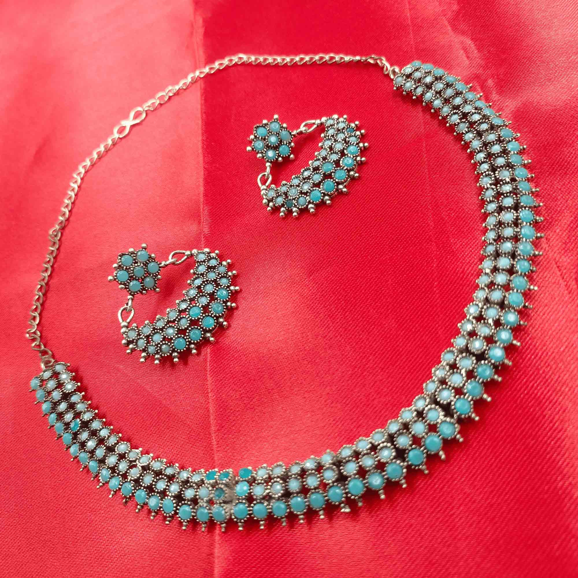 3.The oxidized silver finish of this necklace set adds a touch of vintage charm to any outfit. It is perfect for wearing with traditional Indian outfits, as well as modern western attire.